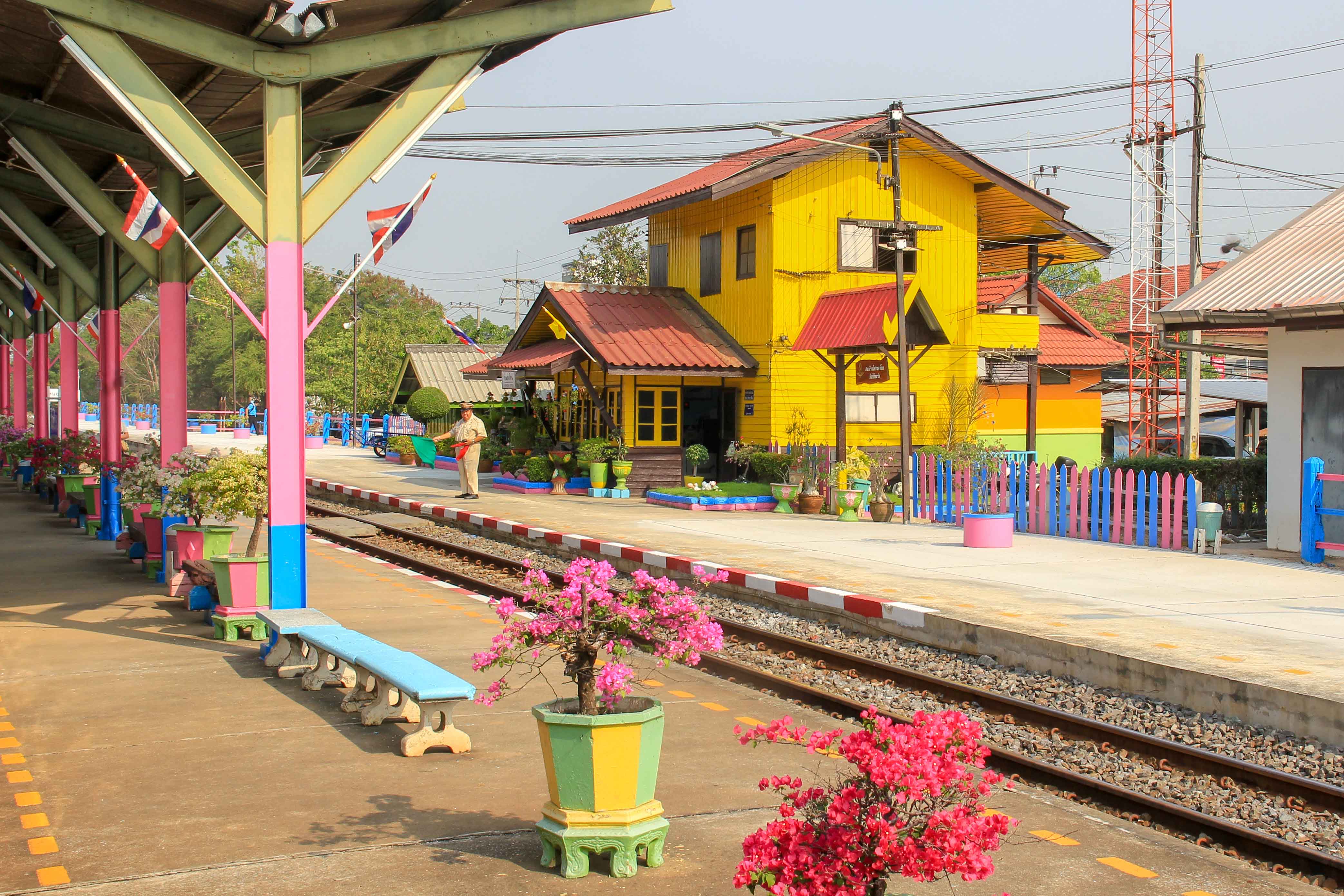 The train journey to Chiang Mai begins in Bangkok at the new Bang Sue Central Station, also known as Krung Thep Aphiwat Central Terminal. Since 2023, all major train routes have started from here, including the connection from Bangkok to Surath Thani in the south. We’ll show you how to book your ticket and where to find the current timetables a little later. The journey to the north of Thailand is really scenic. It goes past green rice fields, wonderful landscapes and through jungle. Striking are the many small, pretty train stations of the provinces. Colorfully decorated and with many flowers, each station shows its best side.