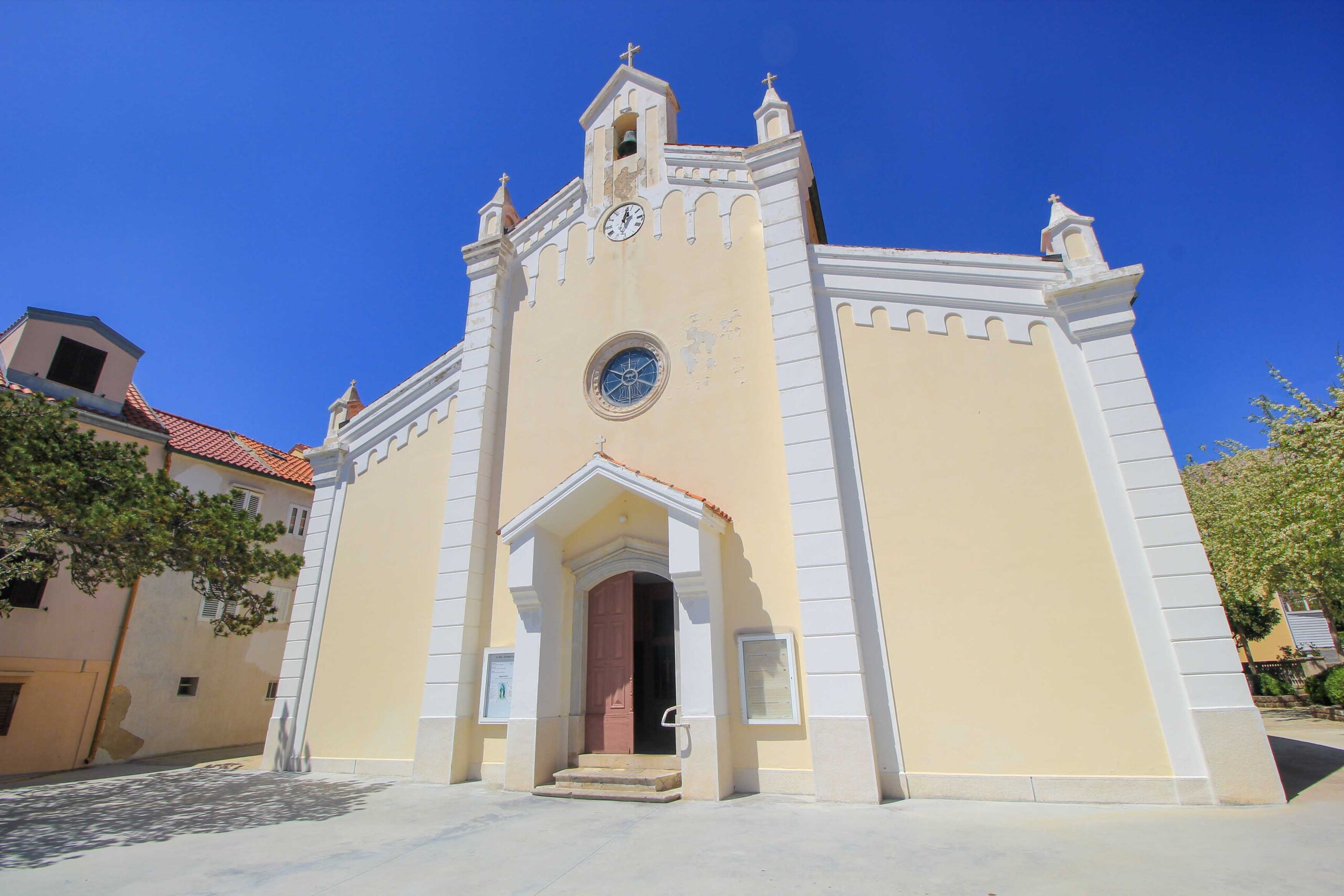 The Church of St. John the Baptist, also known as Crkva Sv. Ivan, was built as early as the 11th century, making it the oldest parish church in Baska. Renovated several times over the years, today it shines in bright yellow and its bell tower can be seen from the distance. It is located on a hill above the town and is therefore a popular destination for walkers and cyclists. Once you reach the top, you will be amazed by the peaceful ambience and the magnificent view of Baska.