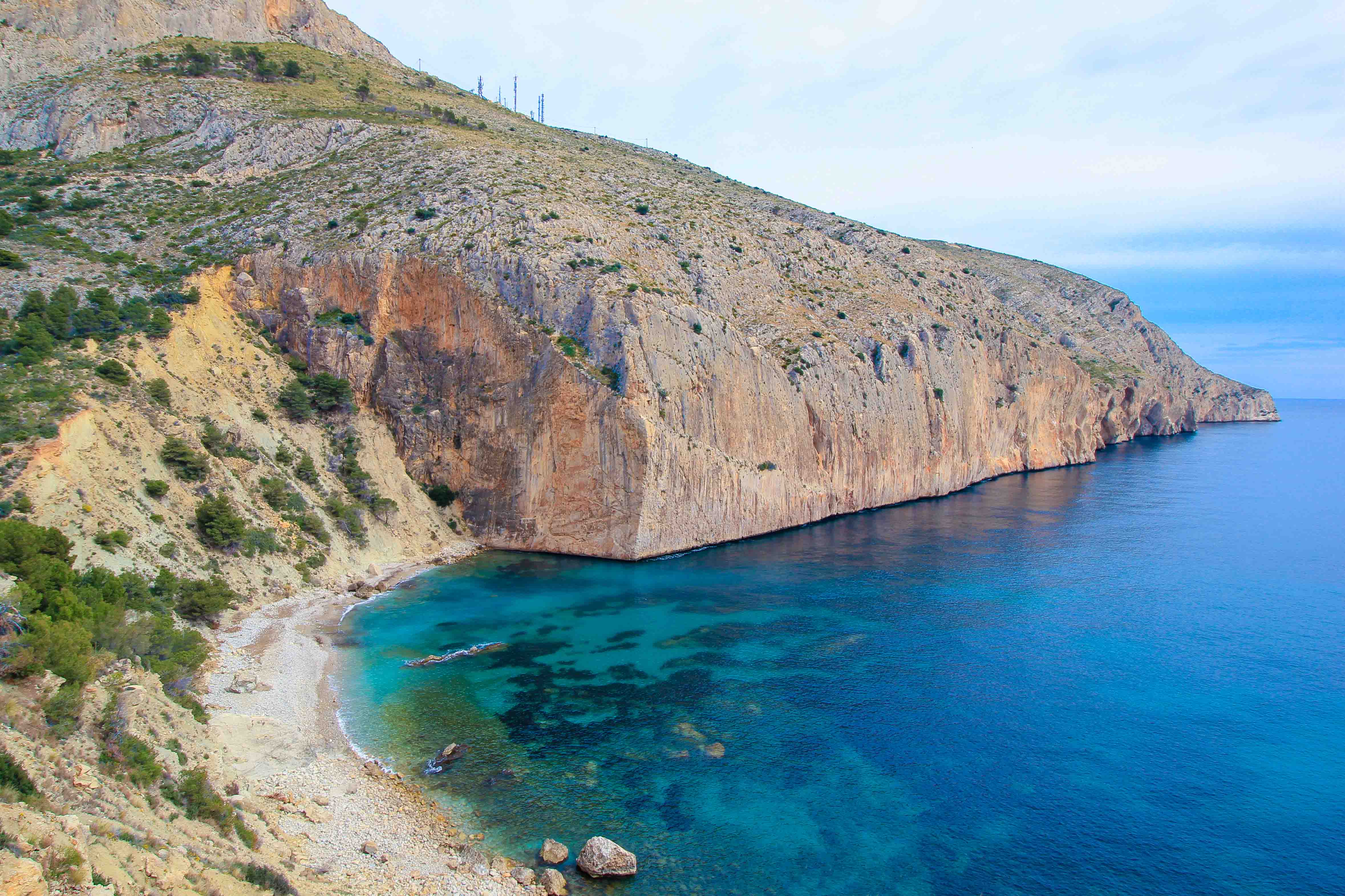 Another beach highlight near Calpe is the beautiful Platja Mascarat beach and the neighboring bay, Cala el Collao. Both are located in the south of the city, around 5 kilometers from the center. Here too you can enjoy a picturesque beach atmosphere with gigantic rock cliffs and unique sea colors. Due to the natural environment you can snorkel there especially well and enjoy, especially in the low season, a really lonely dream beach.