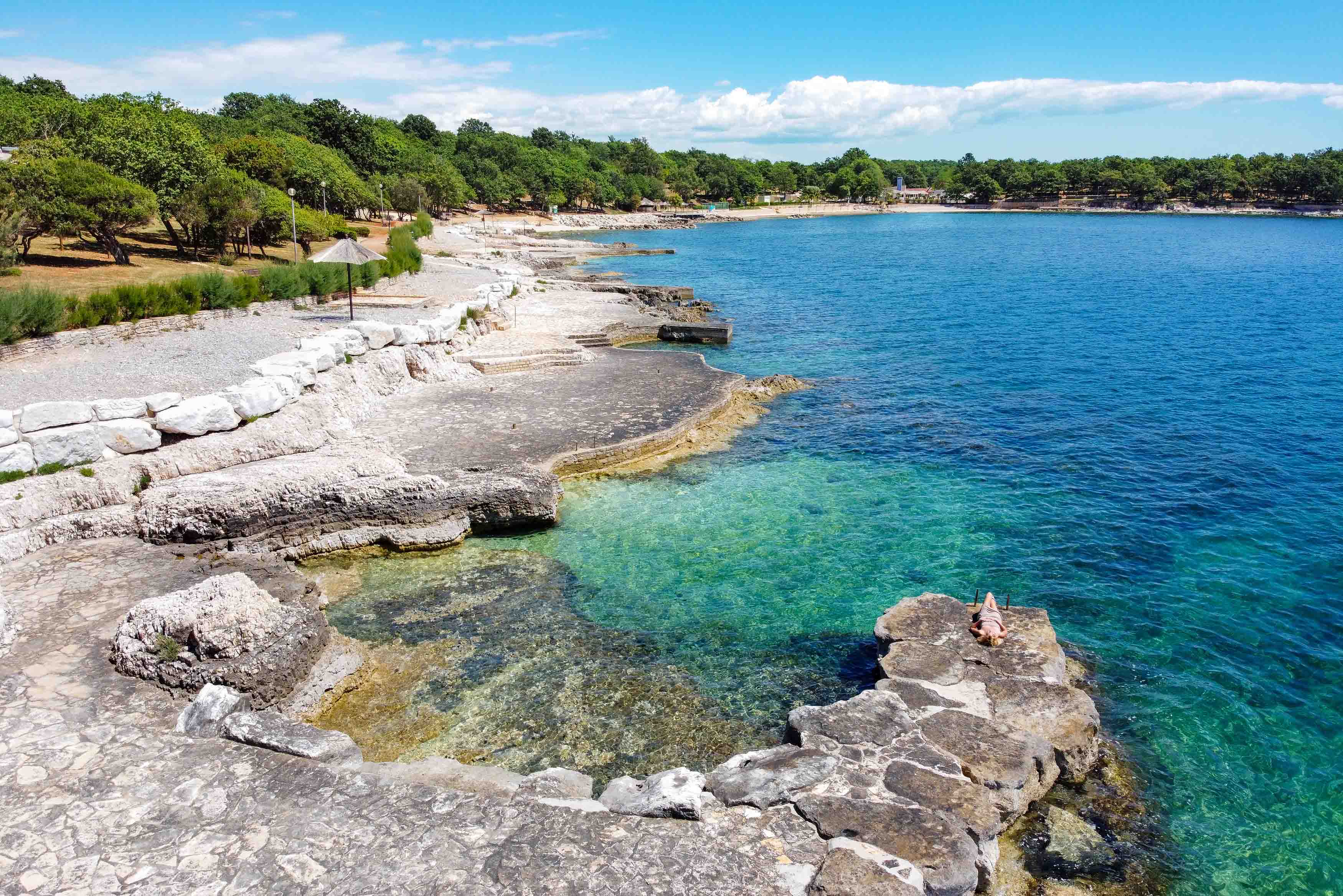 The City Beach is for sure one of the most beautiful beaches in Poreč. Located in close proximity to the old town, between the port and the Brulo apartment complex, this beach delights with a wonderful ambience, fantastic sea colors and a picturesque view of the offshore island of Sveti Nikola and the old town of Poreč. The bathing spots are a mix of small idyllic pebble bays and concrete areas, and next to them a pine forest provides pleasant shade. On foot, you can quickly reach the center and combine sightseeing with swimming.