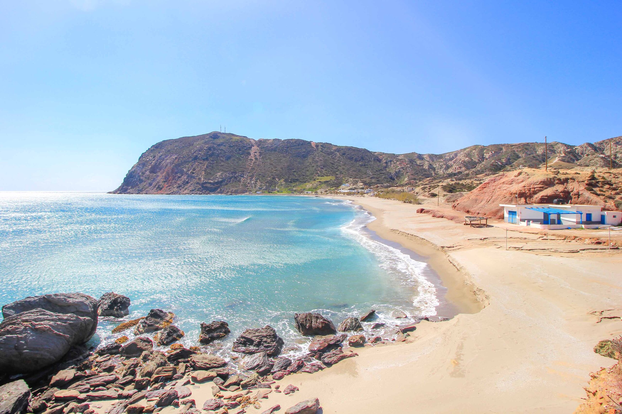 Plathiena Beach is located on the west coast of the vacation island and is an absolute jewel of the best beaches on Milos. The almost kitschy turquoise-blue sea colors are fantastically beautiful at Plathiena, which together with the light fine sand and the reddish rocks form a true picture book beach. Even in the high season, there is relatively little going on at this hidden bathing bay, and so you can enjoy quiet bathing pleasure at its best even in summer. A small beach bar opens during the season, and sun loungers and umbrellas are also available for rent. A real insider tip among the beautiful, quiet beaches of Milos Island!