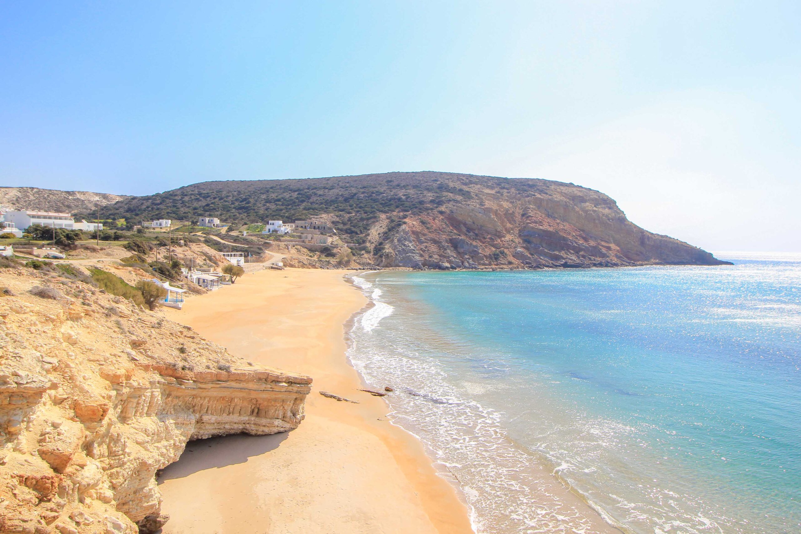 A dream beach on the island of Milos is definitely the particularly idyllic Achivadolimni Beach. This long, white sandy beach is located in a sheltered position directly in the large bay of Milos and also offers families perfect conditions for relaxing beach days. Thanks to its length, even in summer, everyone can find a nice spot under the Greek sun. Visitors love the soft, light sand and the crystal clear turquoise sea, which slopes very gently and makes you want having a swim. In season, a small beach bar opens and provides cool drinks with a picturesque view.