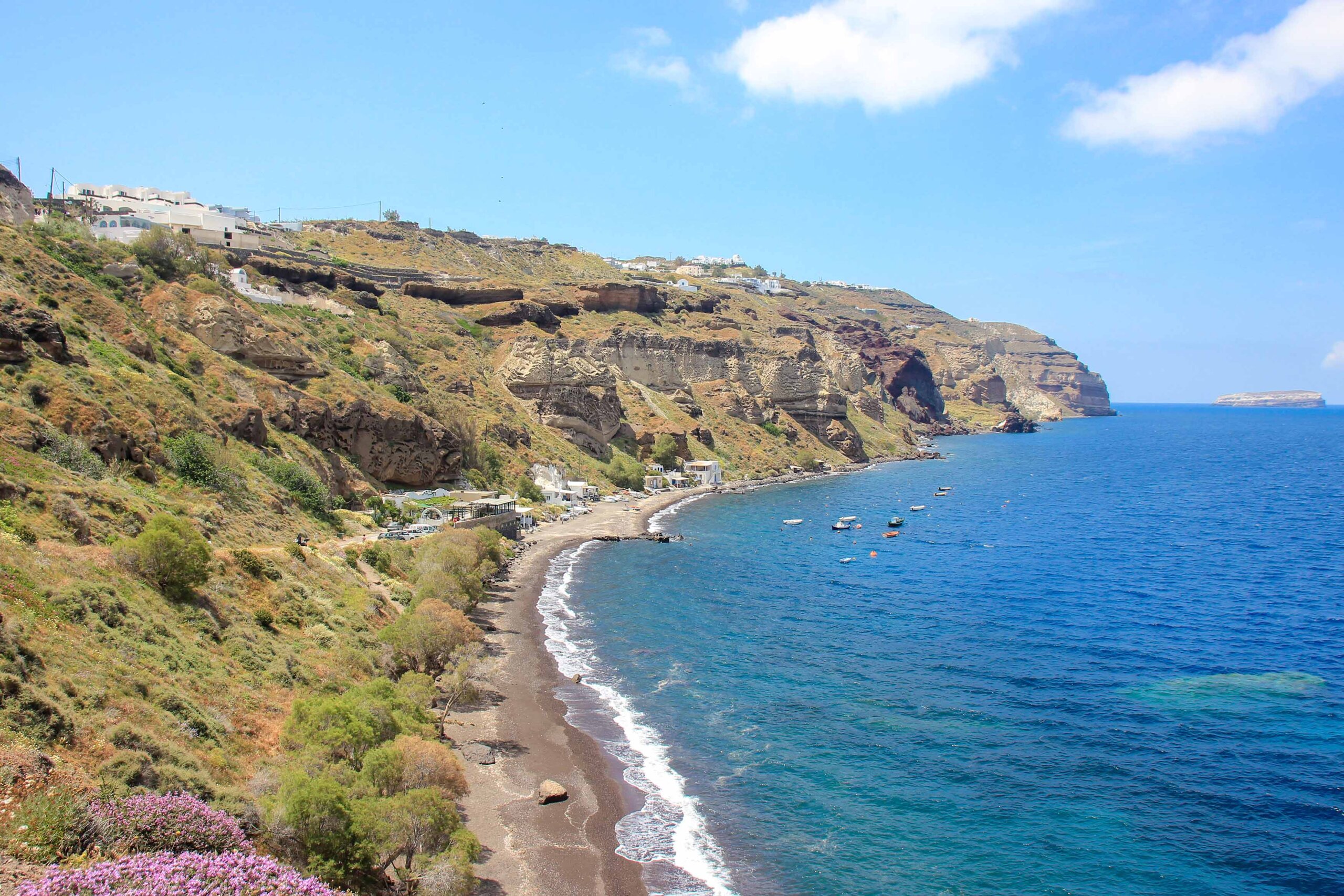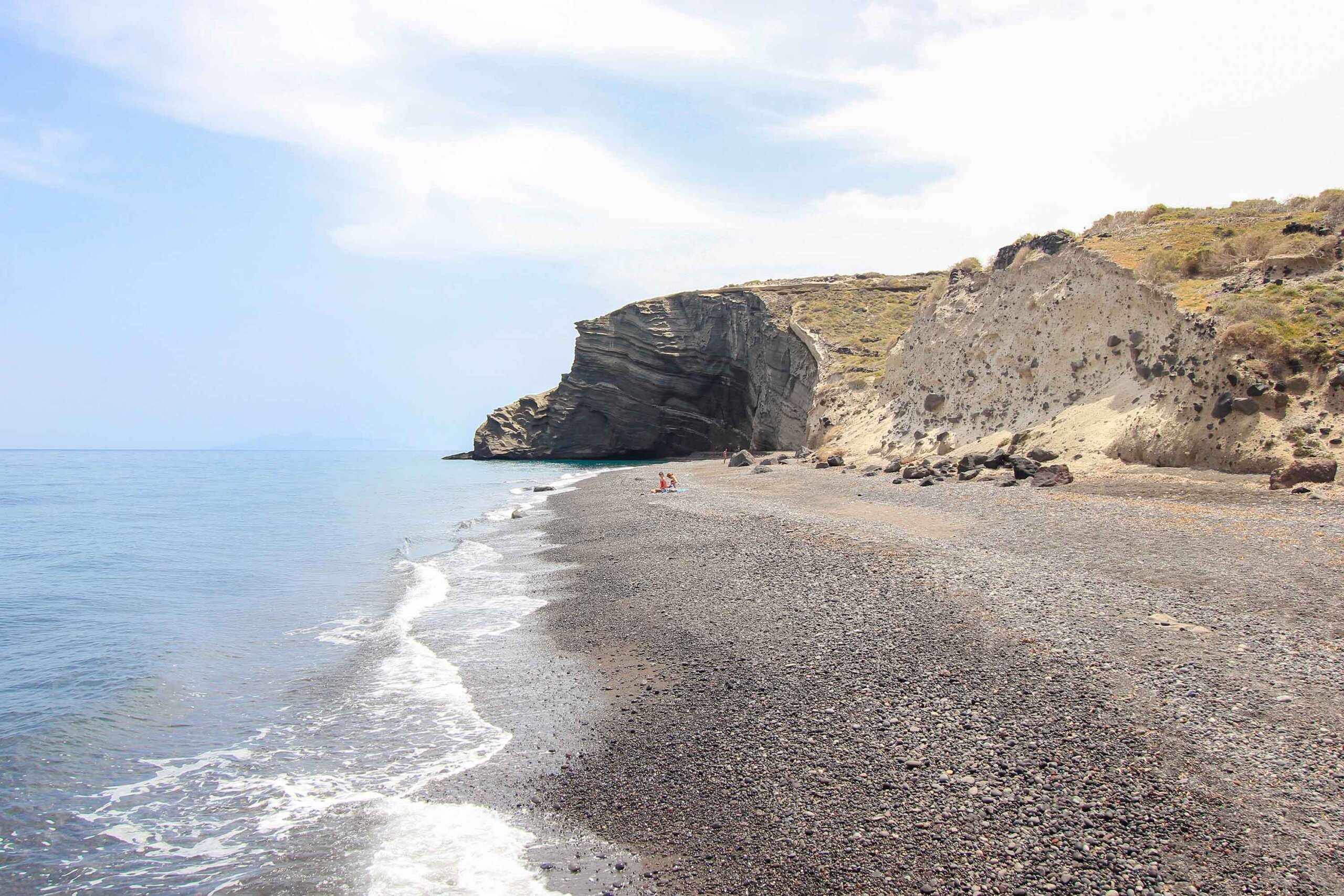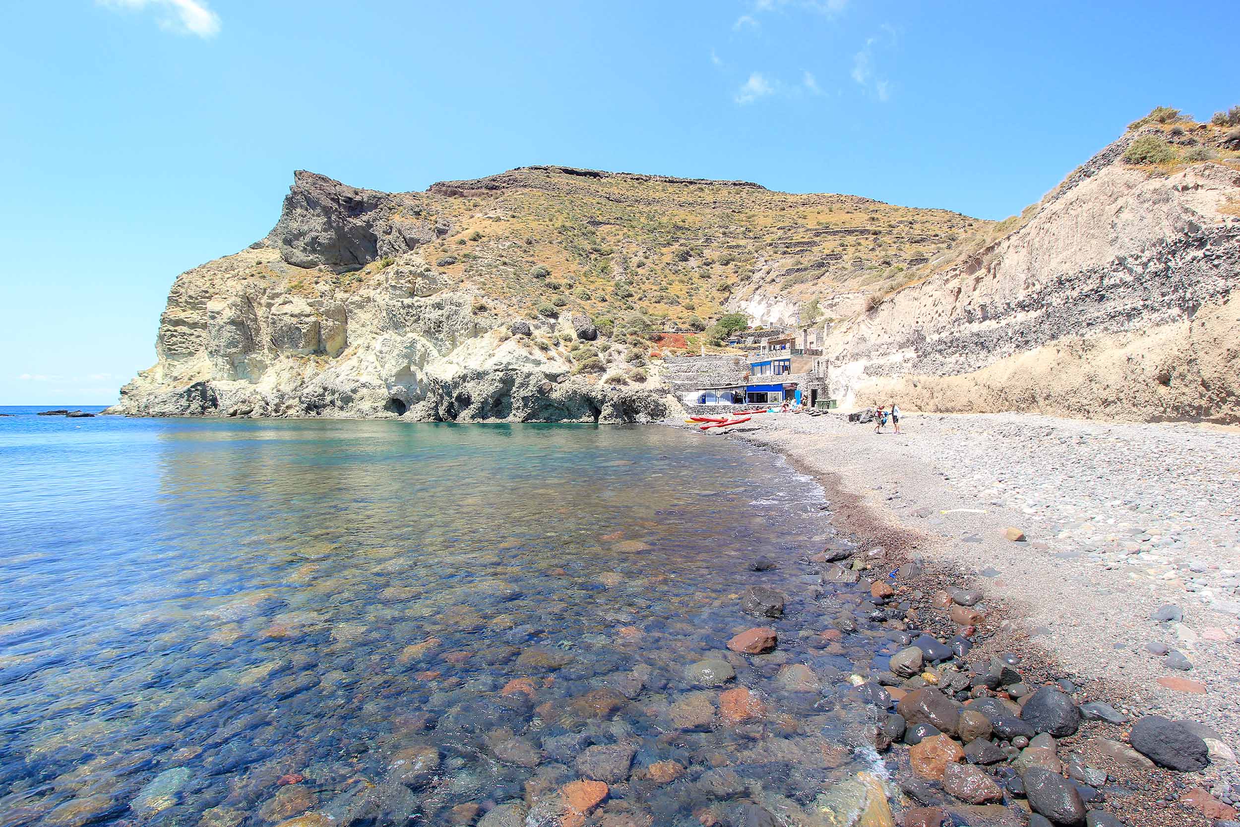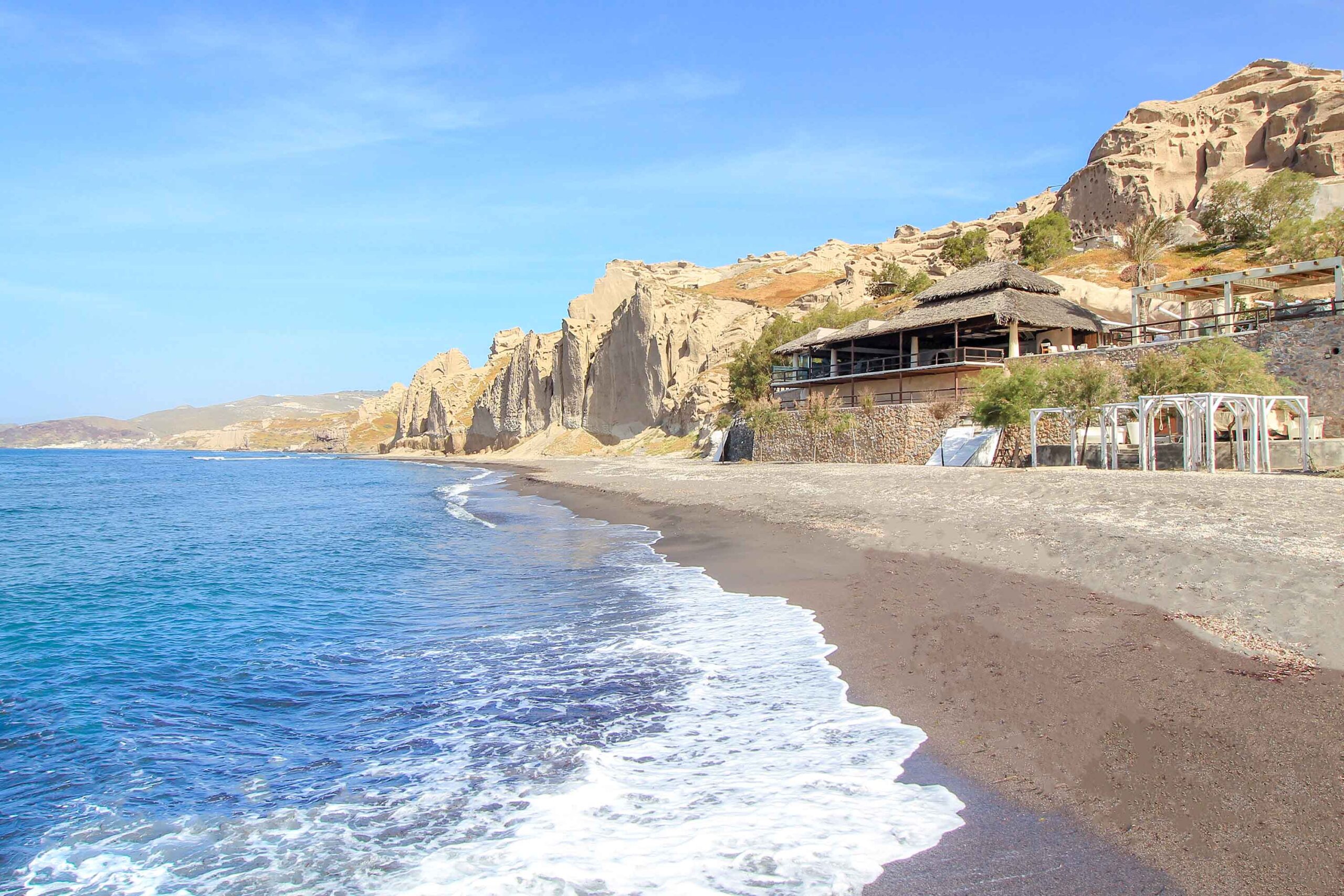 The Black Beach, also known as Mesa Pigadia Beach, is considered Santorini’s best kept secret beach. This hidden black dream beach is located on the southern coast of the vacation island, near the Akrotiri lighthouse, and is truly a magnificent place for a swimming. The Black Beach more than lives up to its name, as the black sand and dark rocks provide a unique panorama. The sea is also crystal clear and even invites you to snorkel. Interesting are also the small caves in the cliffs, known as “Varkadies”, which are used by fishermen as boat parking. In summer, many sailboats anchor at the Black Beach, but this bay can also be reached by a short gravel road.