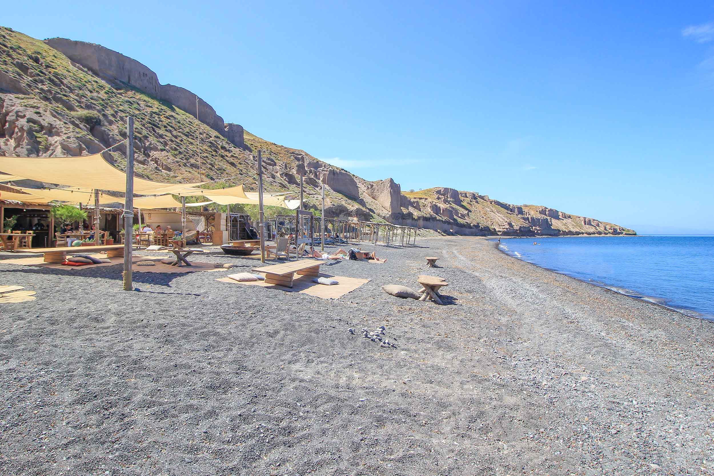 Perivolos Beach is located in the south of the popular resort of Perissa. It connects directly to Perissa Beach, but is a bit quieter than the actual main beach. This fine-grained volcanic sand beach stretches for more than 1 kilometer and thanks to its fabulous facilities, it is an optimal place for a beach vacation. Even in summer, the atmosphere is very relaxed at this elongated bathing bay, perfect if you prefer your beach stay quiet. In addition, there are some lovely beach bars that offer free sunbeds with umbrellas against consumption, and the beautiful promenade behind the beach that leads to the tourist center of Perissa.