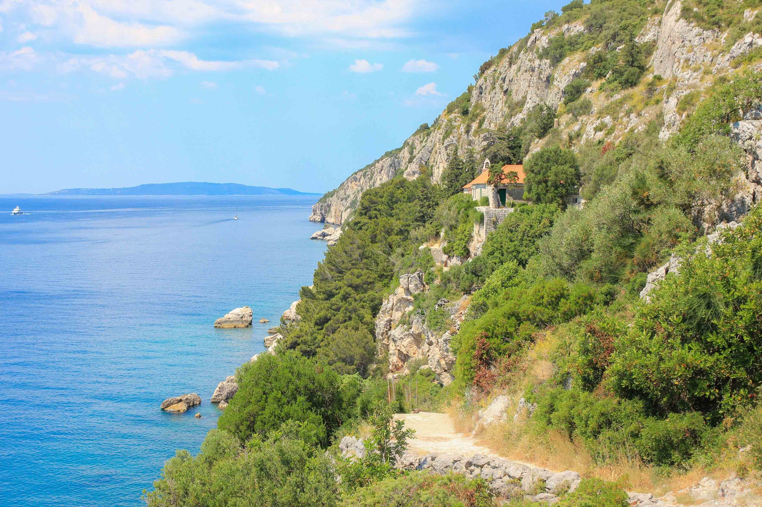One of the most beautiful attractions on Ciovo Island is the church Gospe od Prizidnice, also known as the hermit church of Our Lady of Prizidnica. It is located in the southeast and is a pilgrimage church from 1546. Impressive and a real feature is its breathtaking location on a steep rock face high above the sea. A short hike through the pine forest and the path along the high cliffs allows you to explore Ciovo from one of its most spectacular sides. The path alone is worth coming here! The view is gigantic, and also the small church is absolutely worth seeing.