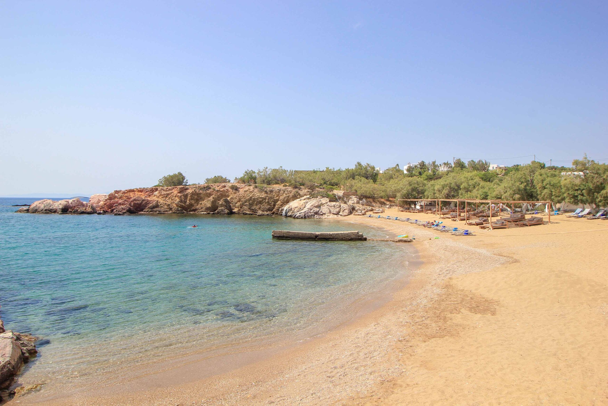 Für einen perfekten Badetag stehen zudem Sonnenliegen und Schirme zum Verleih bereit, und ein schicker Beach-Club sorgt für die nötige Verpflegung. Ein echtes Strand-Highlight auf Antiparos, das man unserer Erfahrung nach unbedingt erlebt haben sollte!