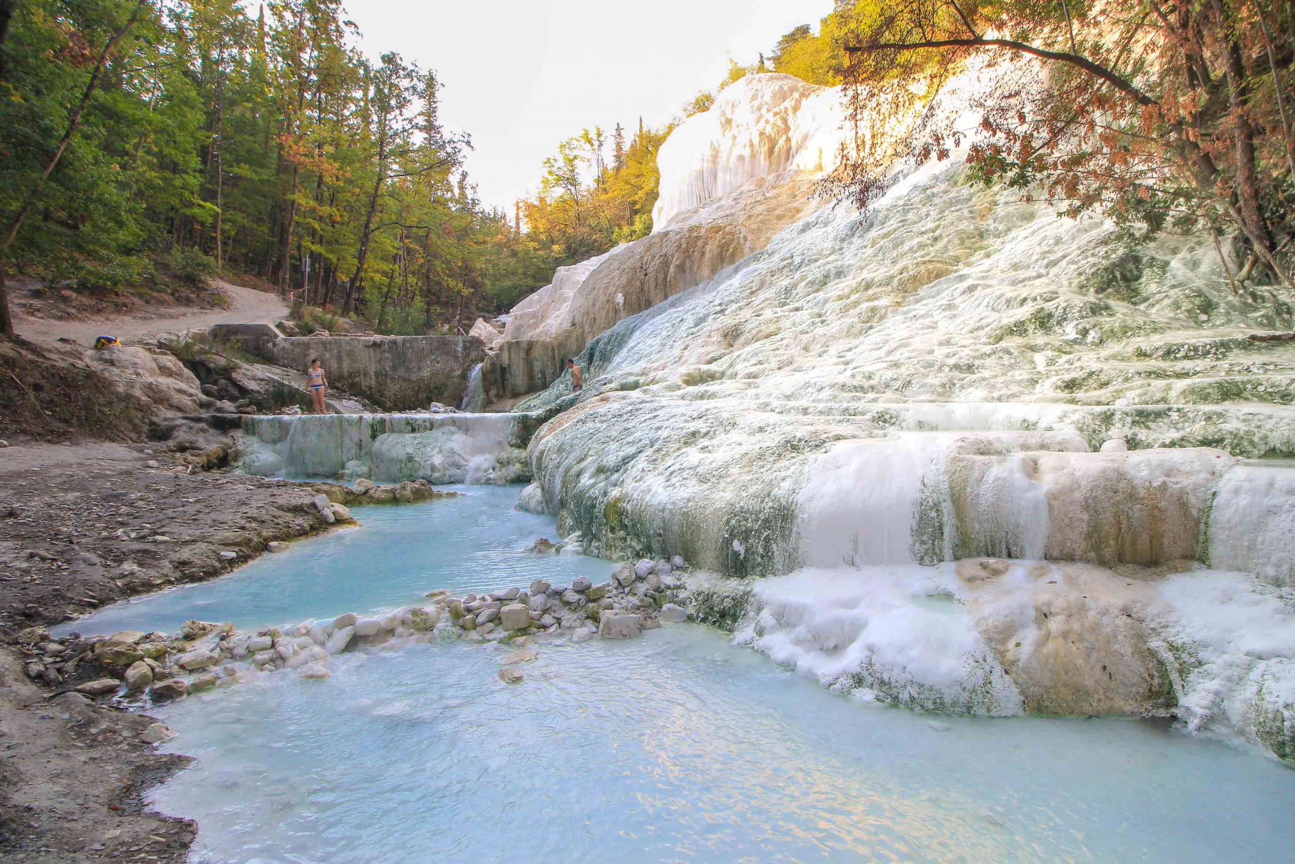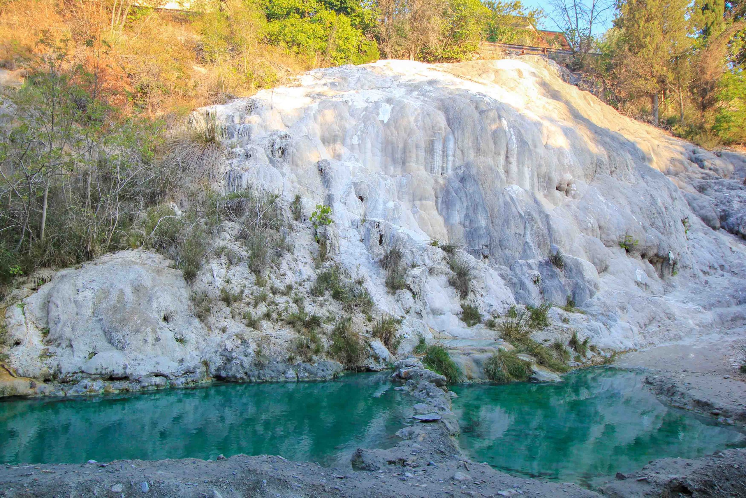 Bei diesen heißen Quellen handelt es sich um Schwefelquellen, die mit 25°C angenehmes Badevergnügen versprechen. Das leicht milchige Wasser zeugt von einem hohen Mineraliengehalt und lässt die Becken bei gutem Licht in türkisen Farben strahlen. Auf einer Länge von rund 2 Kilometern findet man im Fluss verschiedenste Terrassen zum Plantschen, wobei die schönste Stelle definitiv vor dem Travertinfelsen „Balena“, also dem Weißen Wal liegt.