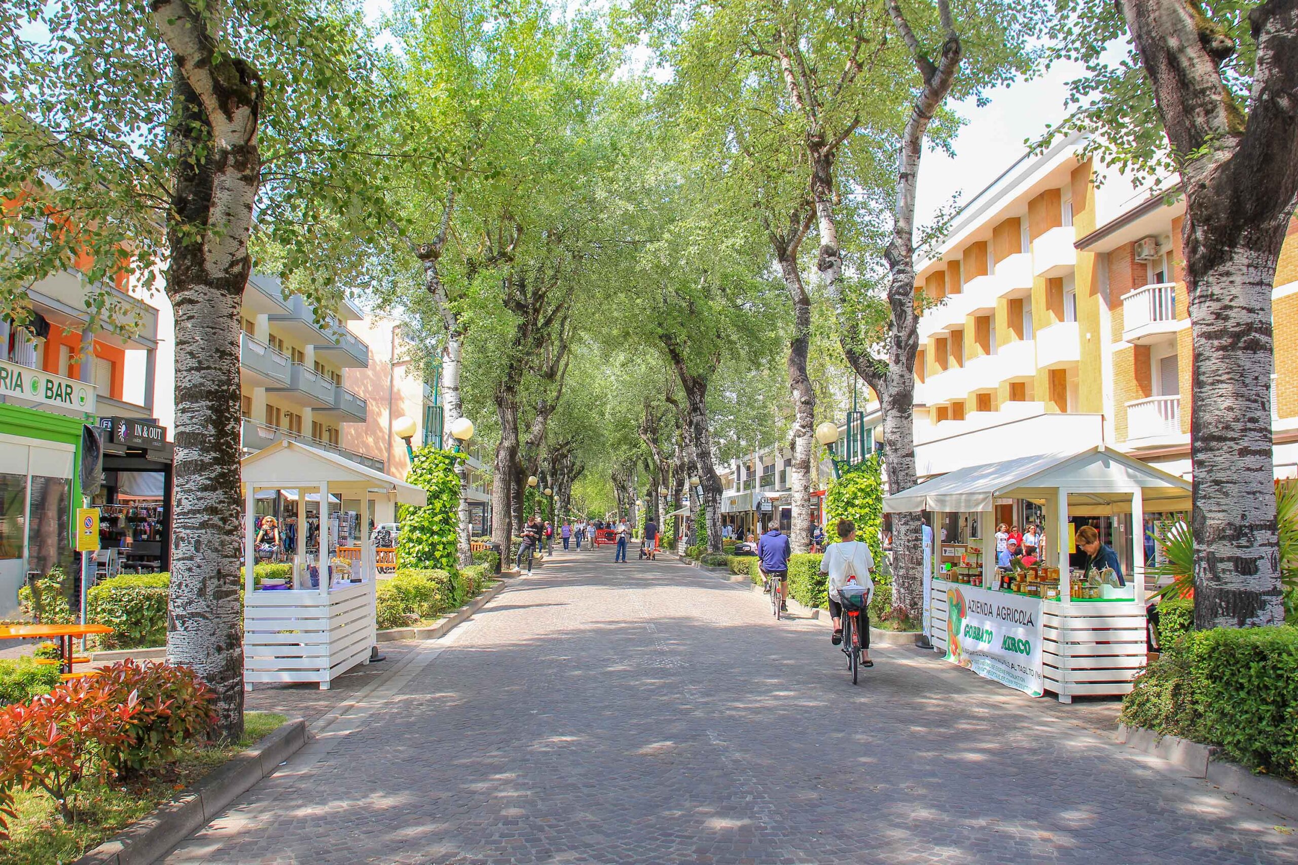 Eine besondere Attraktion ist die lange Fußgängerzone in Bibione. Sie befindet sich im Zentrum der beliebten Feriensiedlung Bibione Spiaggia und verläuft von der Viale Aurora, wo sich auch der Hauptplatz befindet, über den Piazza Niccolò Copernico weiter in die Via delle Costellazioni. Jeden Abend ist diese schicke Flaniermeile komplett autofrei und wird dann zum beliebten Treffpunkt für Touristen. Die Atmosphäre ist stets ausgelassen, was eine grandiose Urlaubsstimmung verspricht. Gesäumt mit zahlreichen Geschäften, Boutiquen, Souvenirläden, Spielhallen und Bars, bietet diese riesige Fußgängerzone die besten Möglichkeiten zum Shoppen und Ausgehen. Obendrein befindet sich dort der größte Teil der Gastro-Szene, und so laden entlang der Fußgängerzone zahlreiche Restaurants, Cafés und Eisdielen zum Verweilen und Genießen ein.