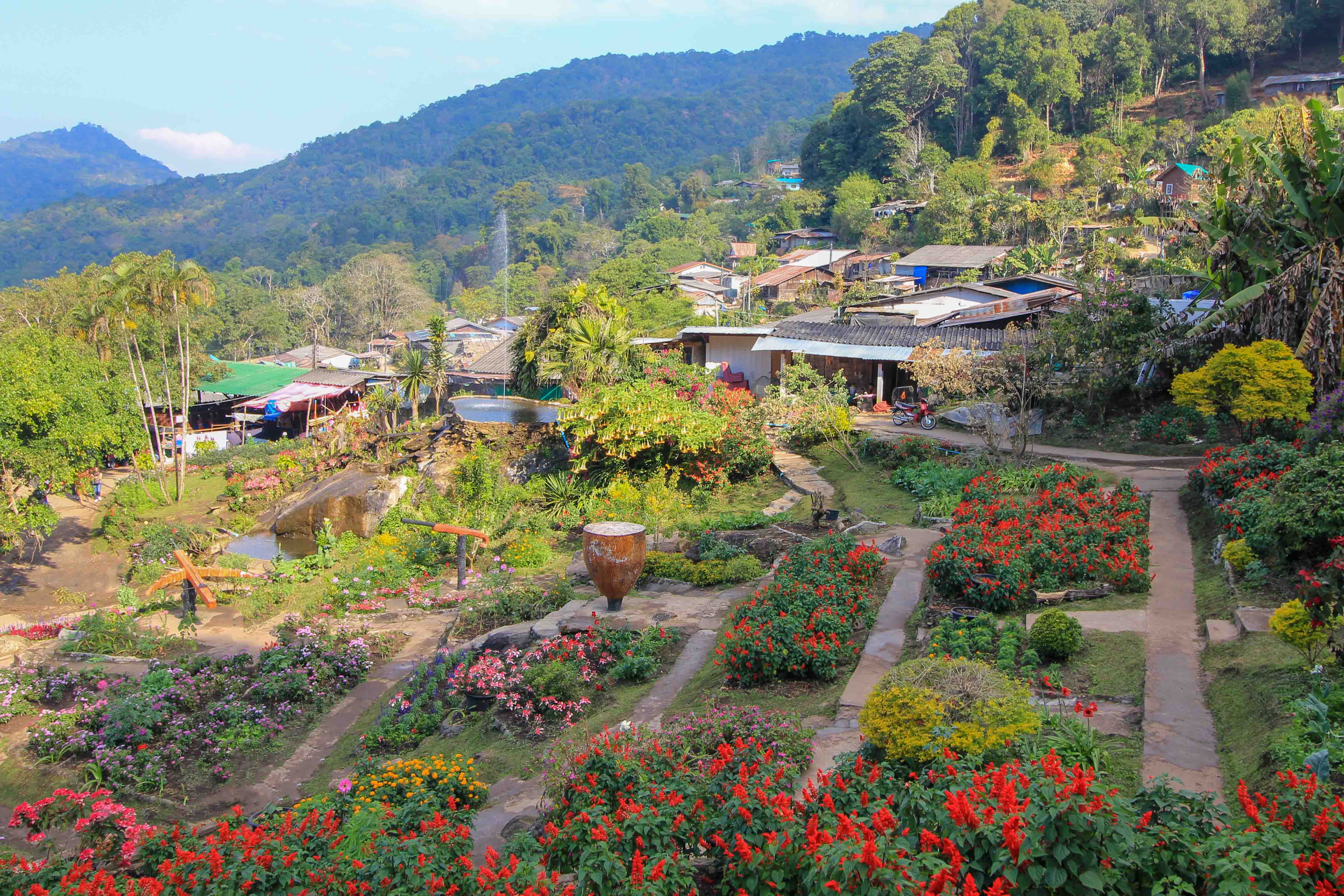 Das Hmong Village liegt im oben schon erwähnten Doi Suthep Nationalpark und gehört zu den absolut schönsten Bergdörfern der gesamten Region. Malerisch eingebettet in eine tiefgrüne Dschungellandschaft inmitten der Berge, ist es ein beliebtes Ziel für Ausflüge und Unternehmungen ab Chiang Mai. Das Besondere an diesem Dorf sind mitunter die prächtig blühenden Blumengärten, welche sowohl Einheimische als auch Touristen zum Staunen bringen. Wer mag, leiht sich vor Ort eine traditionelle thailändische Tracht aus und lässt sich damit in der urigen Bergdorfkulisse fotografieren. Eine echt geniale Aussicht auf das Hmong Village und den tiefen Dschungel hat man vom Aussichtspunkt „Doi Pui View Point“ aus!