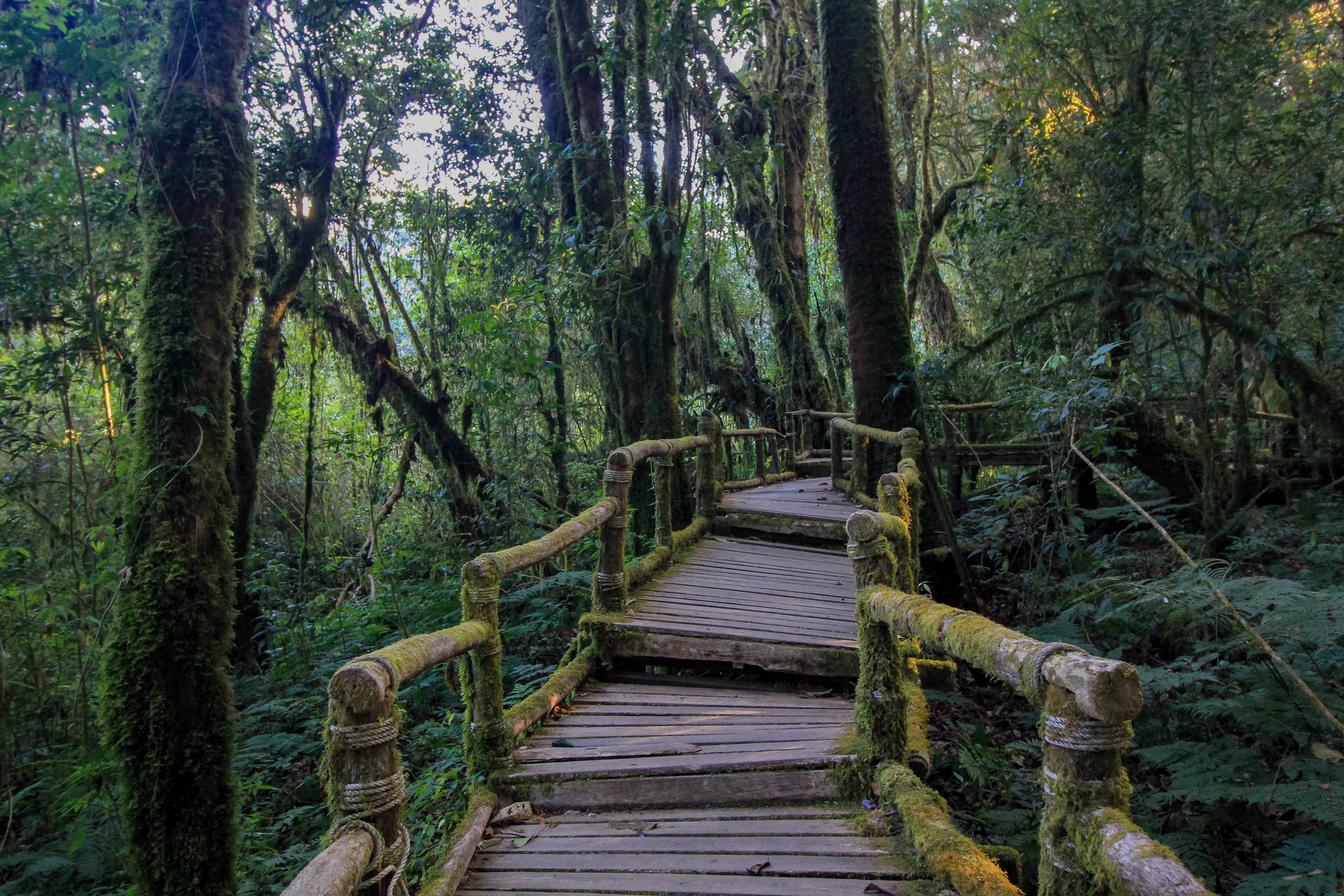 Der Ang Ka Luang Nature Trail gehört zu den absoluten Insidertipps für den Doi Inthanon. Er liegt gleich gegenüber dem Gipfelrundwanderweg, wird trotzdem aber von den meisten Touristen übersehen. Schade eigentlich, denn dieser Trail ist eine der coolsten Sehenswürdigkeiten im Doi Inthanon Nationalpark. Bei der Wanderung entlang der Holzpfade entdeckst du eine ganz andere Welt, einen mystisch und mit Moosen bewachsenen Urwald wie aus einem Märchen. Dieser Dschungel ist ein wahres Naturparadies, und einen Abstecher in diesen immergrünen Wald können wir dir echt ans Herz legen. Die kleine Wanderung durch den Dschungel dauert gerade mal 20 Minuten und lässt sich so optimal in diese Nationalpark-Tour integrieren.