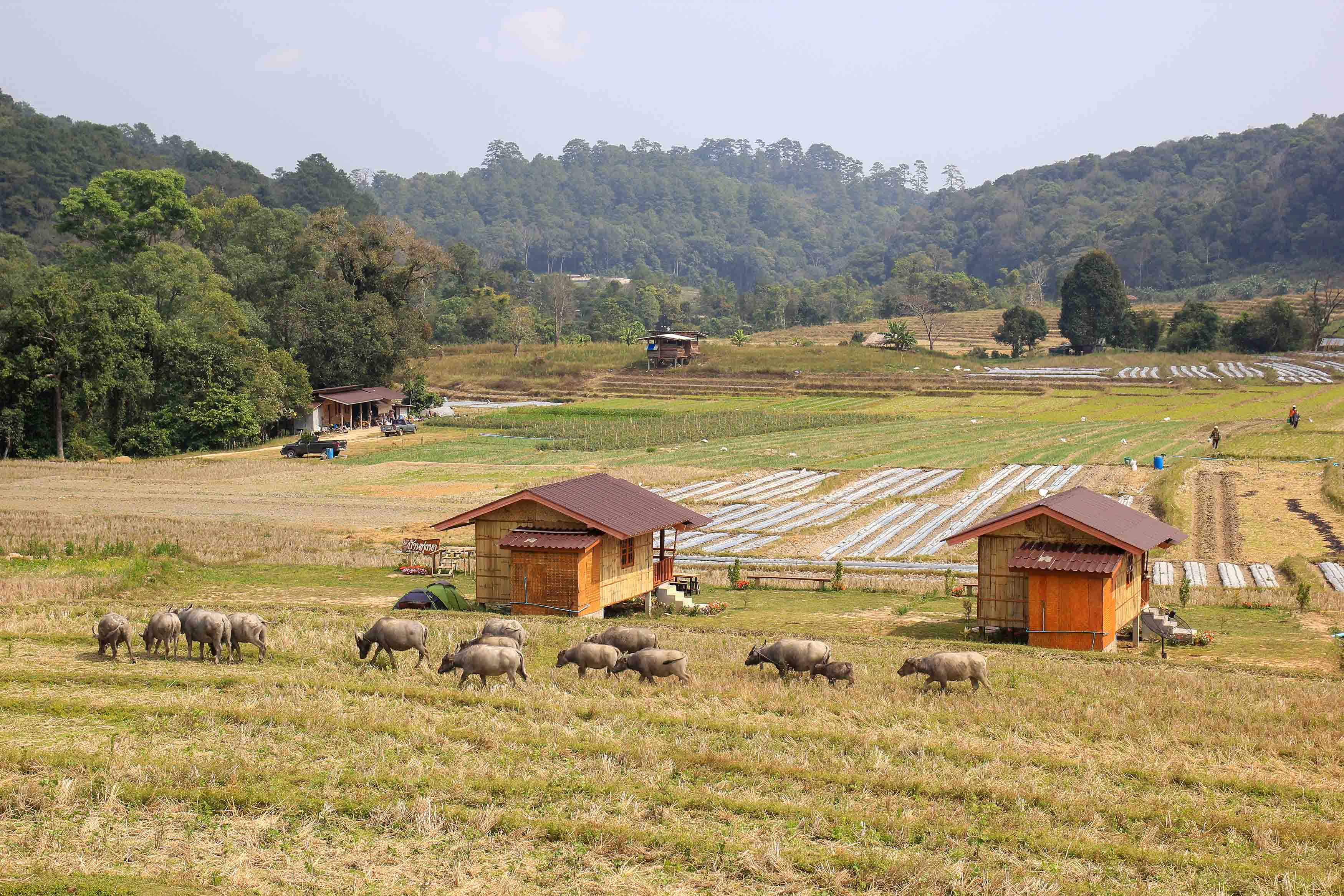 Ein persönliches Highlight bei unserer Tour zum Doi Inthanon Nationalpark wir die Übernachtung inmitten der Reisfelder von Chom Thong. Für dieses Erlebnis sind die Bungalows Nok Chan Mee Na ein echter Geheimtipp. Eine wunderschöne Anlage mit Camping-Optionen abseits vom Trubel gelegen und das inmitten faszinierender Reisterrassen. Hier kann man gemütlich am Pool chillen, lecker essen und eine herrliche Umgebung genießen. Vor allem, wenn du gerne ein paar Tage in der Gegend vom Doi Inthanon verbringen möchtest, ist dieser Ort eine tolle Empfehlung für einen Aufenthalt.