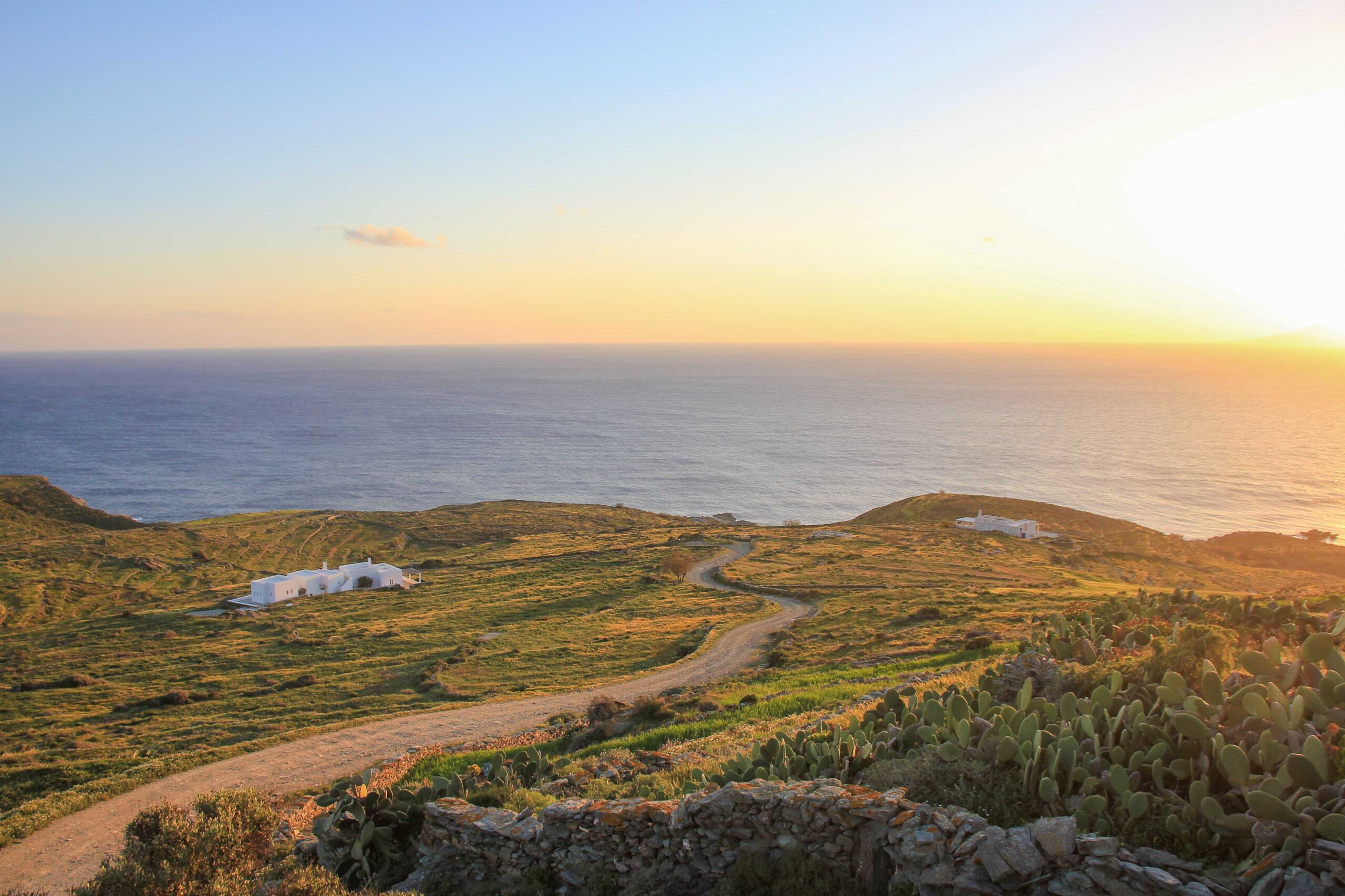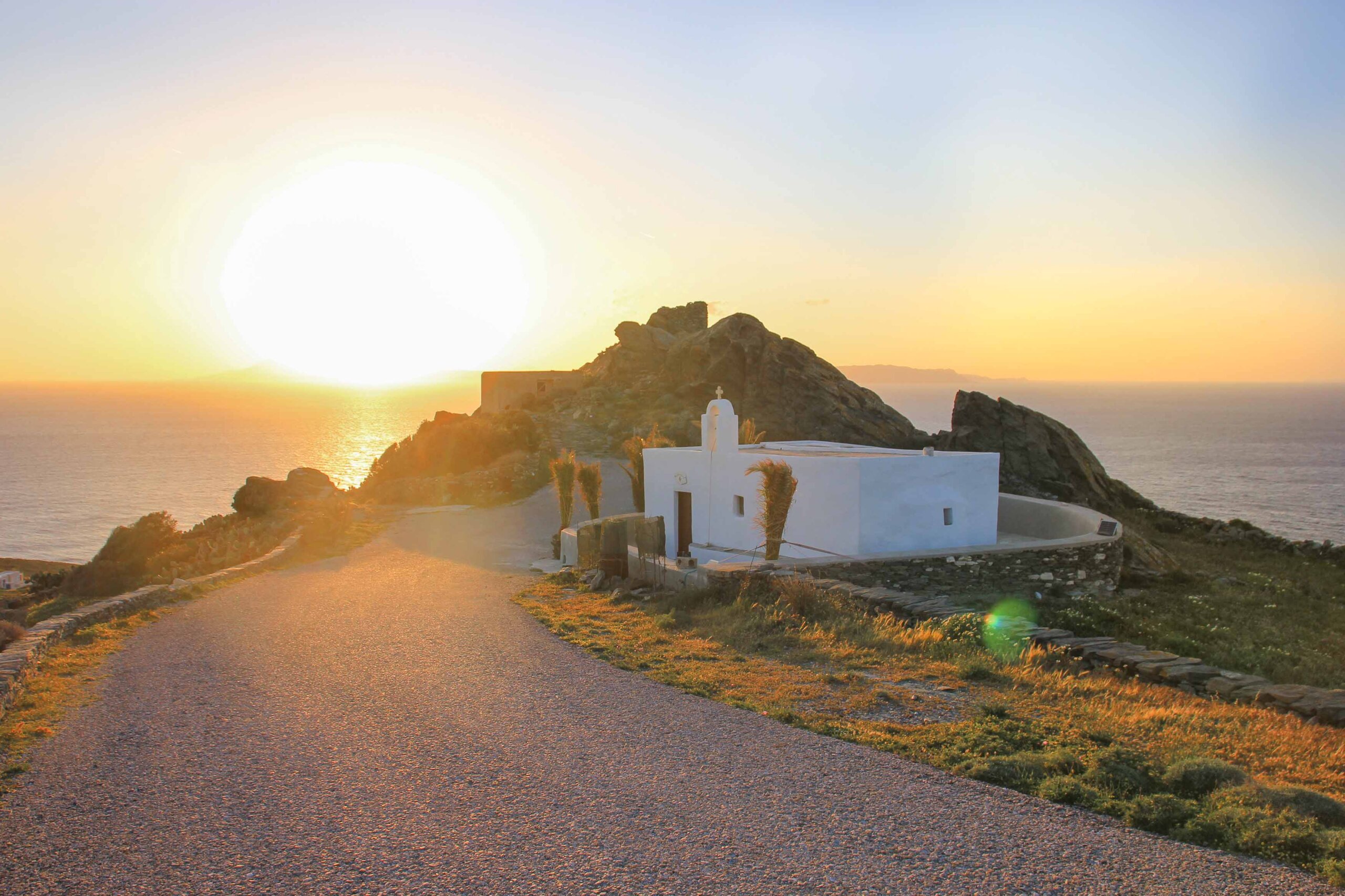 Die Sonnenuntergänge auf Folegandros zählen zu den schönsten der Kykladen. Ein echter Insidertipp dafür ist ein Besuch der romantischen, weißen Chrysopigi Kirche. Sie befindet sich am nordöstlichen Zipfel der Insel, genau dort, wo die Asphaltstraße endet. Die kleine Kirche liegt auf einer Anhöhe, eingebettet in einer unglaublich schönen Landschaft und begeistert mit einem grandiosen Ausblick aufs Meer. Vor allem Einheimische, aber auch ein paar Touristen kommen mittlerweile gerne hierher, um das magische abendliche Ambiente und die spektakuläre Sonnenuntergangs-Stimmung zu genießen.