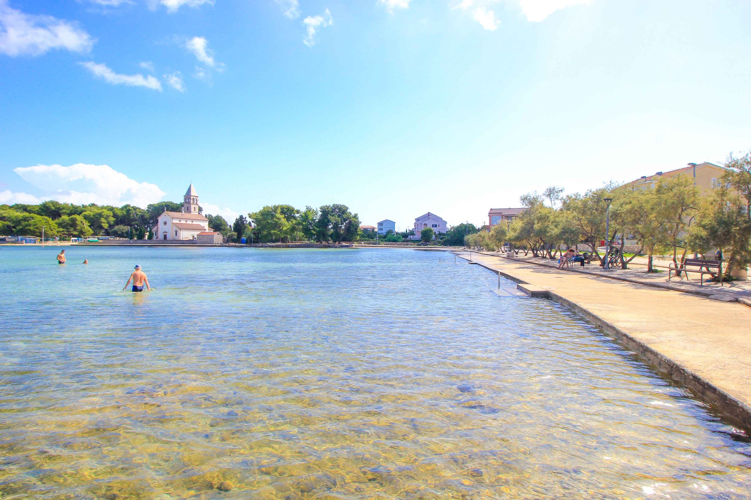 Der Strand Lucina befindet sich im Urlaubsort Pasman und ist ein toller Ort zum Relaxen und Baden. Er liegt rund 200 Meter westlich vom Ortszentrum, wo sich auch Restaurants und Cafés befinden. Der Betonstrand ist absolut sauber, und teilweise bieten Stufen Eintritt ins kühle Nass. Einfach grandios ist auch der sandige Meeresboden, der zum Spielen und Planschen einlädt. Das Wasser fällt sehr flach ab, was auch Familien mit kleinen Kindern zu schätzen wissen. Einfach malerisch ist zudem der Blick auf die Kirche von Pasman, den man beim Schwimmen und Sonnenbaden genießt. Das authentische Flair in der Ortschaft ist absolut magisch, und ein Garant für einen schönen Badeurlaub auf Pasman.