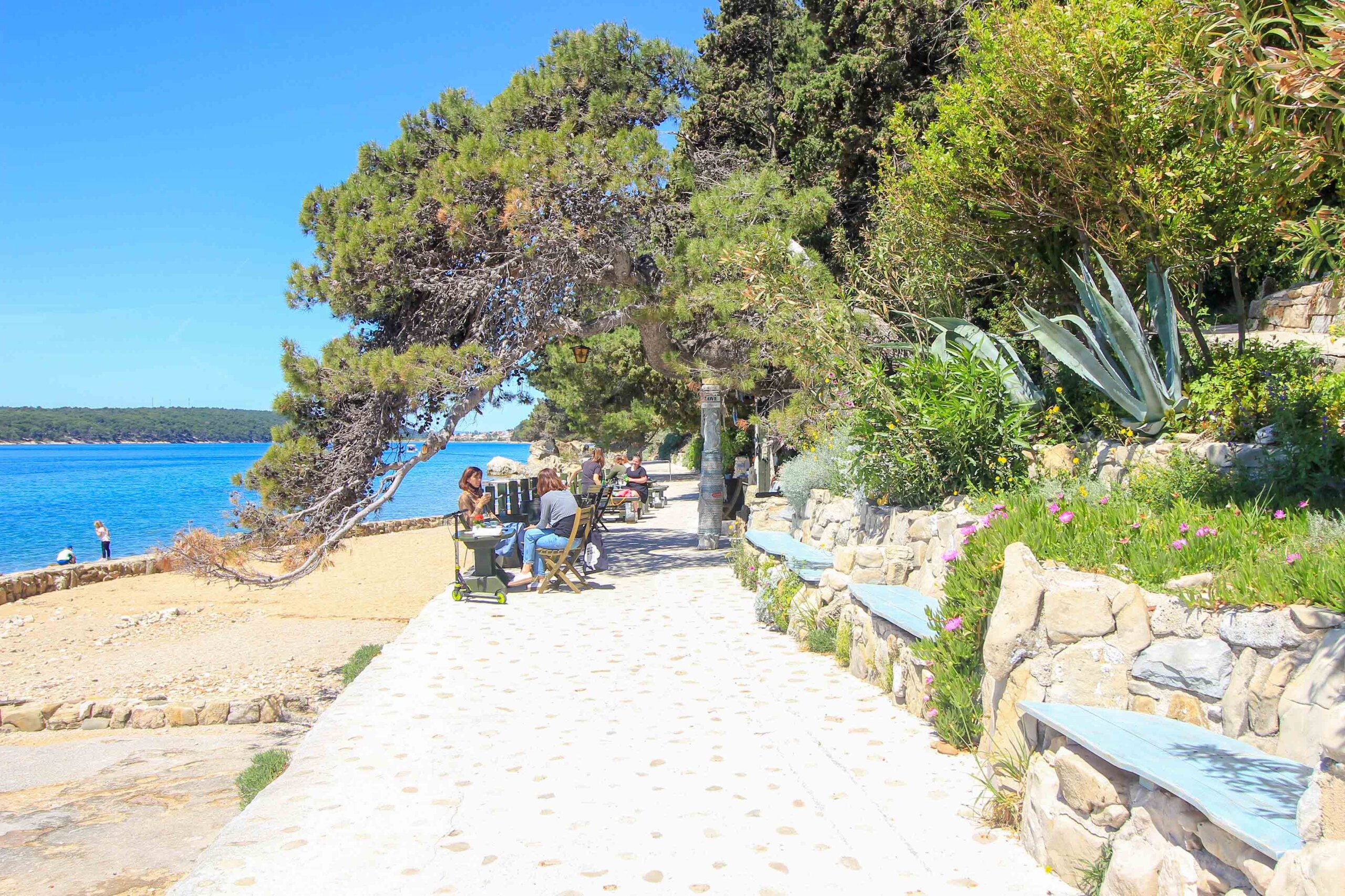 Der Komrcar Park ist die älteste und zugleich schönste Parkanlage der Insel Rab. Diese wundervolle Oase der Ruhe liegt direkt neben der Altstadt, auf der Halbinsel Frkanj, und ist der perfekte Ort für ausgedehnte Spaziergänge in der Natur. Mitte des 19. Jahrhunderts angelegt, kann man heute zahlreiche mediterrane Bäume und Pflanzenarten wie Kiefern, Zypressen, aber auch Wacholder, Agaven und sogar riesige Feigenkakteen bewundern. Viele verwinkelte Wege führen durch die Anlage, und ein malerischer Küstenweg bietet ein Panorama wie aus dem Bilderbuch. Unterwegs befinden sich immer wieder gemütliche Cafés mit Blick aufs Meer, wo man das atemberaubende Ambiente auf sich wirken lassen kann. Ein echter Geheimtipp, um die Insel Rab von einer ihrer idyllischsten Seite kennenzulernen.
