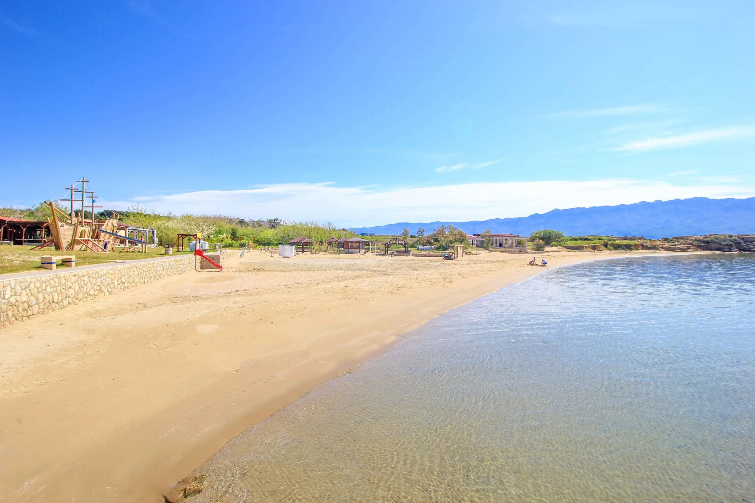 Der Plaza Livacina ist einer der beliebtesten Strände der Insel Rab. Gelegen gleich neben dem berühmten Paradiesstrand, erwartet dich auch hier eine fantastische Bucht zum Baden. Dieser wunderschöne Sandstrand fällt sanft ins glasklare Meer ab, was insbesondere Familien schätzen. Eindrucksvoll sind auch die Felsen am oberen Abschnitt, die eine Art Halbinsel bilden und für einfabelhaftes Ambiente sorgen. Auch das touristische Angebot mit Restaurants, Bars, Spielplatz, Volleyball und Parkplätze ist top, und somit steht einem herrlichen Badetag nichts mehr im Wege. Wer mag, der mietet sich Sonnenschirm und Liege oder sucht sich ein kühles Plätzchen hinten im Pinienwald.