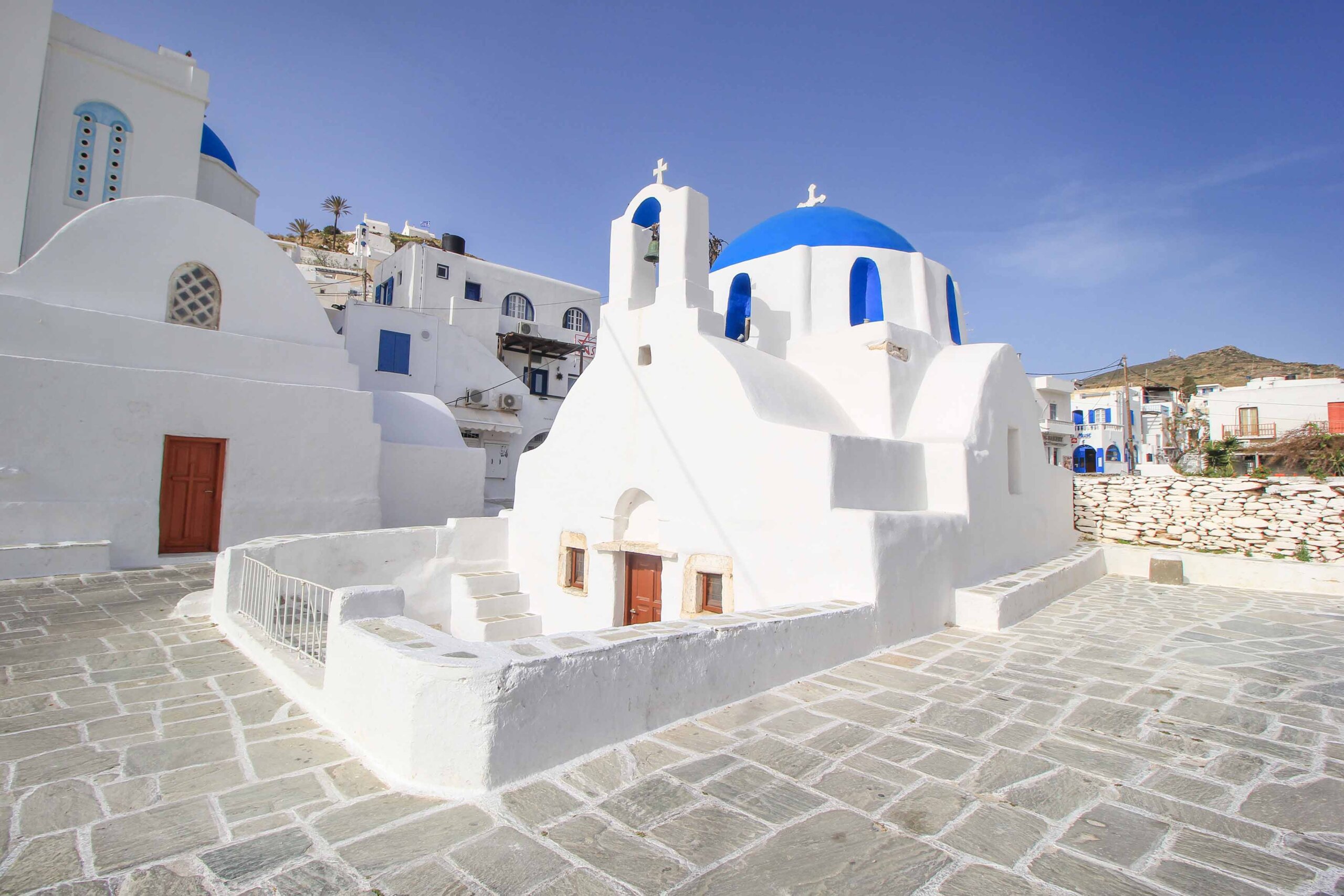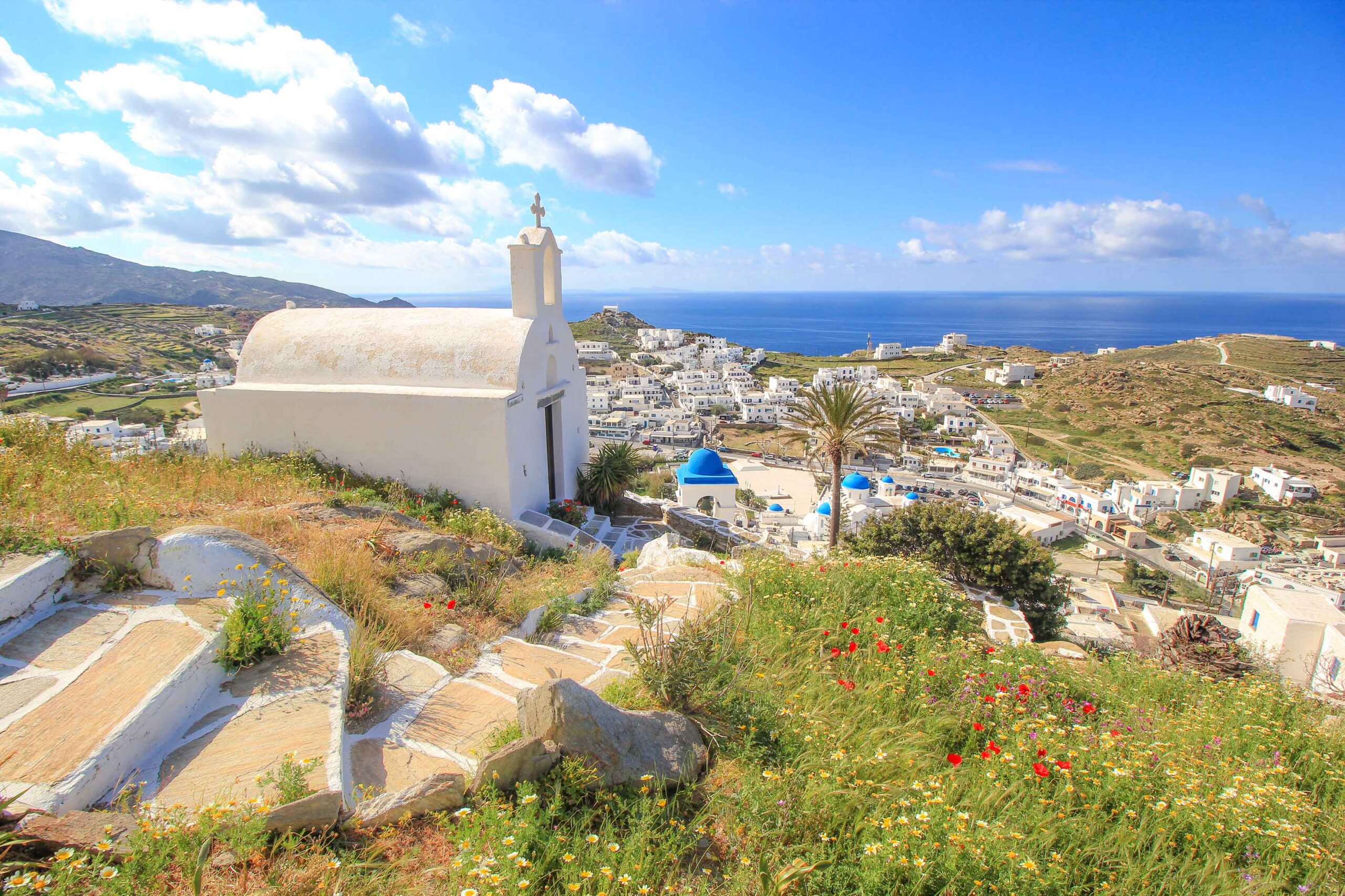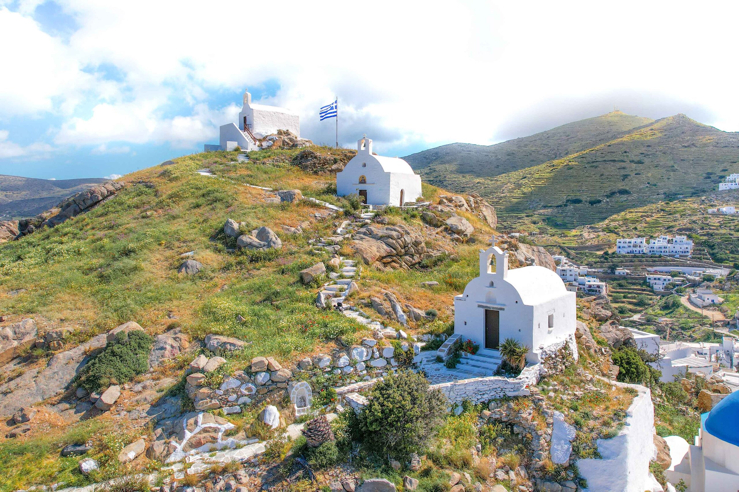 Eine außergewöhnlich hübsche Sehenswürdigkeit auf Ios bilden die 3 kleinen Kapellen Agios Eleftherios, Agios Georgios und Agios Nikolaos, die sich auf einem Hügel oberhalb der Chora und nur ein paar Schritte entfernt von der berühmten Kirche Panagia Gremiotissa befinden. Ein beeindruckender, mit Blumen geschmückter Zickzack Pfad verbindet diese kleinen Kirchen miteinander und zaubert eine wahrlich magische Kykladen-Kulisse. Am höchsten Punkt angekommen, erlebt man außerdem eine absolut spektakuläre Aussicht auf die Insel Ios und das Meer. Ein Geheimtipp ist ein Besuch zu Sonnenuntergang, um das grandiose Farbenspiel zu genießen.