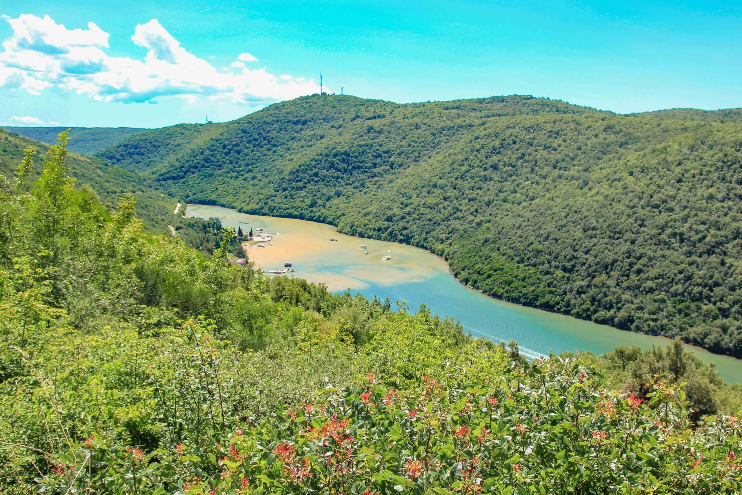 Der Limski Kanal verläuft zwischen den Ferienregionen Vrsar und Rovinj und ist eine wahre Naturschönheit in Istrien. Er hat eine Länge von rund 11 Kilometern und führt durch ein malerisches Flusstal hinein ins Meer. Dank des relativ niedrigen Salz- und des hohen Sauerstoffgehaltes werden hier Fische und Muscheln gezüchtet. Bootsausflüge in den Limski Fjord sind eine beliebte Aktivität, die in den umliegenden Urlaubsorten angeboten wird. Aber auch, wenn du mit dem Auto unterwegs bist, kannst du entlang der Küstenstraße wunderschöne Aussichtspunkte über den Kanal genießen. Dort befinden sich zudem kleine Marktstände, die regionale Produkte wie Schnäpse und Olivenöl verkaufen.