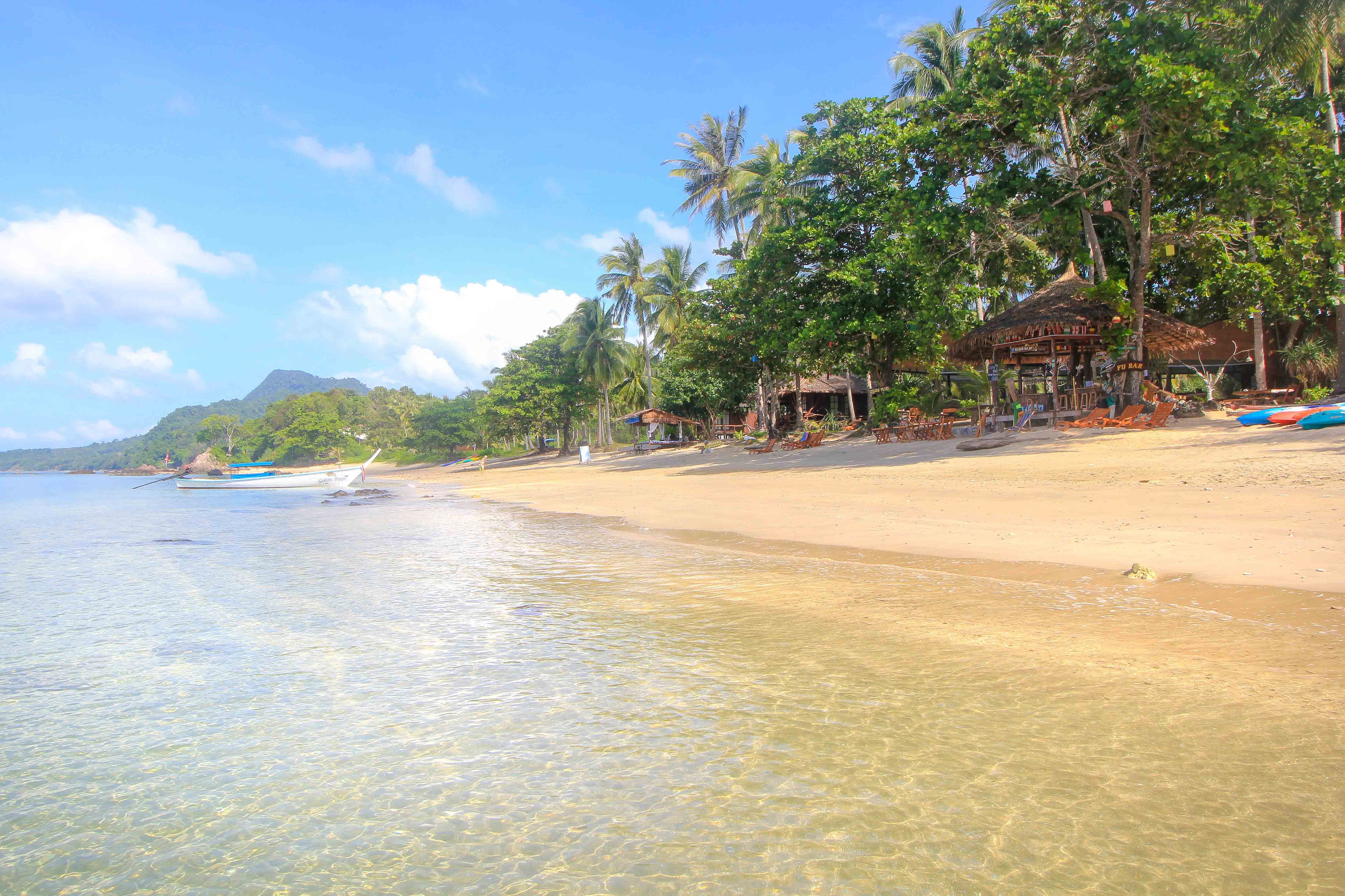 Einer der bekanntesten und schönsten Strände ist mit Sicherheit der Golden Pearl Beach. Hier ist auch am meisten los, wenn man das auf dieser Insel so überhaupt sagen kann. Bei einem kühlen Getränk in der legendären Fu Bar lässt sich das traumhafte Ambiente gleich doppelt genießen.