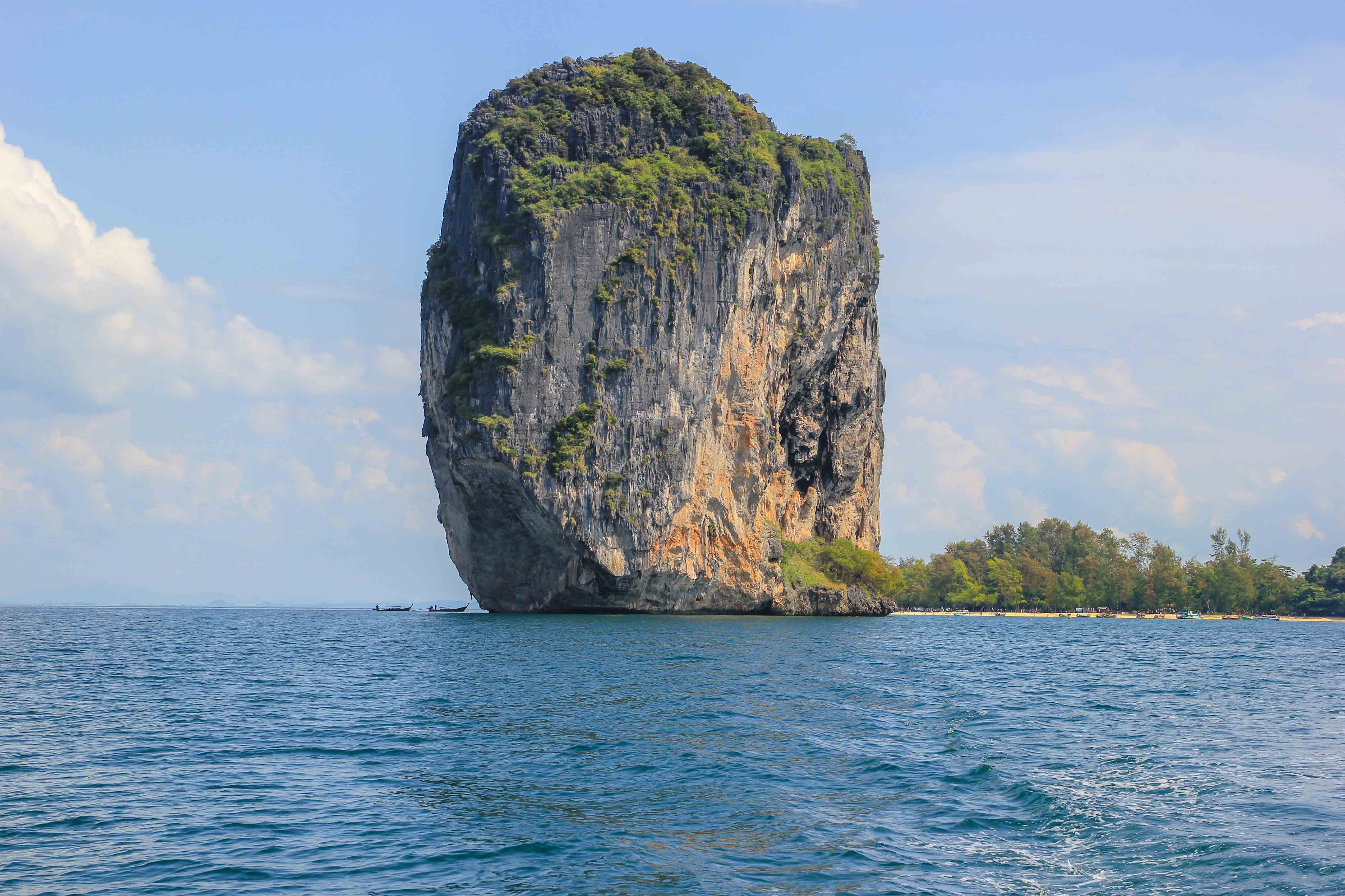 Da die Insel recht klein ist, kann man bei einem Spaziergang am Strand einen Teil der Insel abgehen und sich gleich ein schönes Plätzchen zum Baden suchen. Der für uns persönlich schönste Strandabschnitt befindet sich direkt vor dem mächtigen Kalksteinfelsen, welcher dich wahrscheinlich gleich an den berühmten Railey Beach erinnern wird. Hier kann es jedoch gerade zu Stoßzeiten in der Hauptsaison, wenn viele Ausflüge auf einmal kommen, recht voll werden. In der Nebensaison war das Flair deutlich entspannter. Aber, je weiter du den Strand hinaufschlenderst, desto eher findest du ein ungestörtes Plätzchen zum Baden.