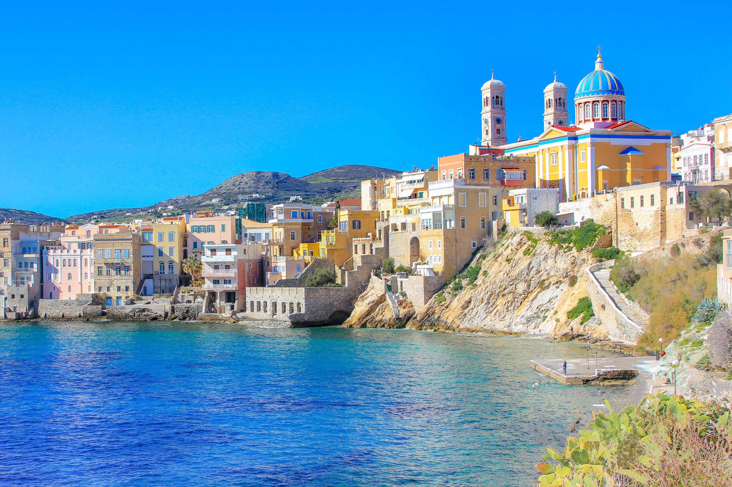 Die Insel Syros gehört definitiv zu den schönsten Kykladeninseln. Absolut sehenswert ist die Hauptstadt Ermoupoli, die mit neoklassizistischen Bauwerken, pastellfarbenen Häusern und interessanten Museen beeindruckt. Dort befindet sich auch das wunderschöne Apollon-Theater aus dem Jahr 1861, eine kleinere Version der Mailänder Scala. Besuchen sollte man obendrein Ano Syros, ein malerisches Dorf oberhalb von Ermoupoli, das eine atemberaubende Aussicht auf das Meer bietet. Aber auch der Rest der Insel ist ein Traum! Tolle Strände wie Galissas und Kini, laden zum Entspannen und Schwimmen ein. Außerdem gibt es malerische, absolut authentische Dörfer, und auch den einsamen nördlichen Inselteil Ano Meria mit den tollen Möglichkeiten für Wanderungen sollte man gesehen haben.