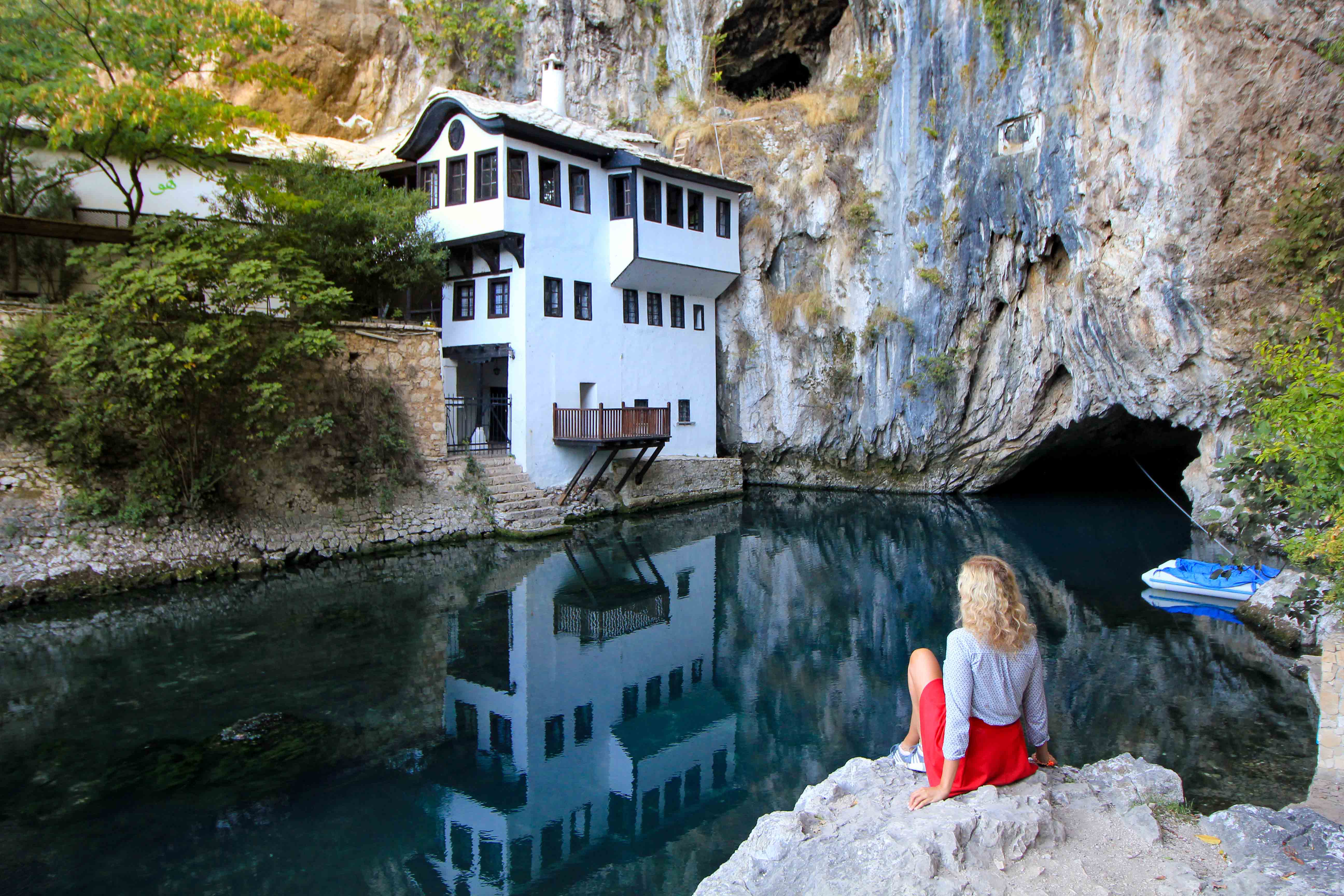 Das Blagaj Kloster liegt nur rund 13 Kilometer von Mostar entfernt und ist eine der berühmtesten Sehenswürdigkeiten des Landes. Zwar ist das Kloster (Derwischhaus) allein schon einen Besuch wert, aber vor allem das Umfeld ist schlichtweg überwältigend schön. Gelegen direkt an einer riesigen Felswand am Buna Fluss, möchte man hier am liebsten den ganzen Tag das Panorama bestaunen. Etwas flussabwärts befinden sich einige Restaurants, in denen man direkt am Wasser, lecker essen kann.