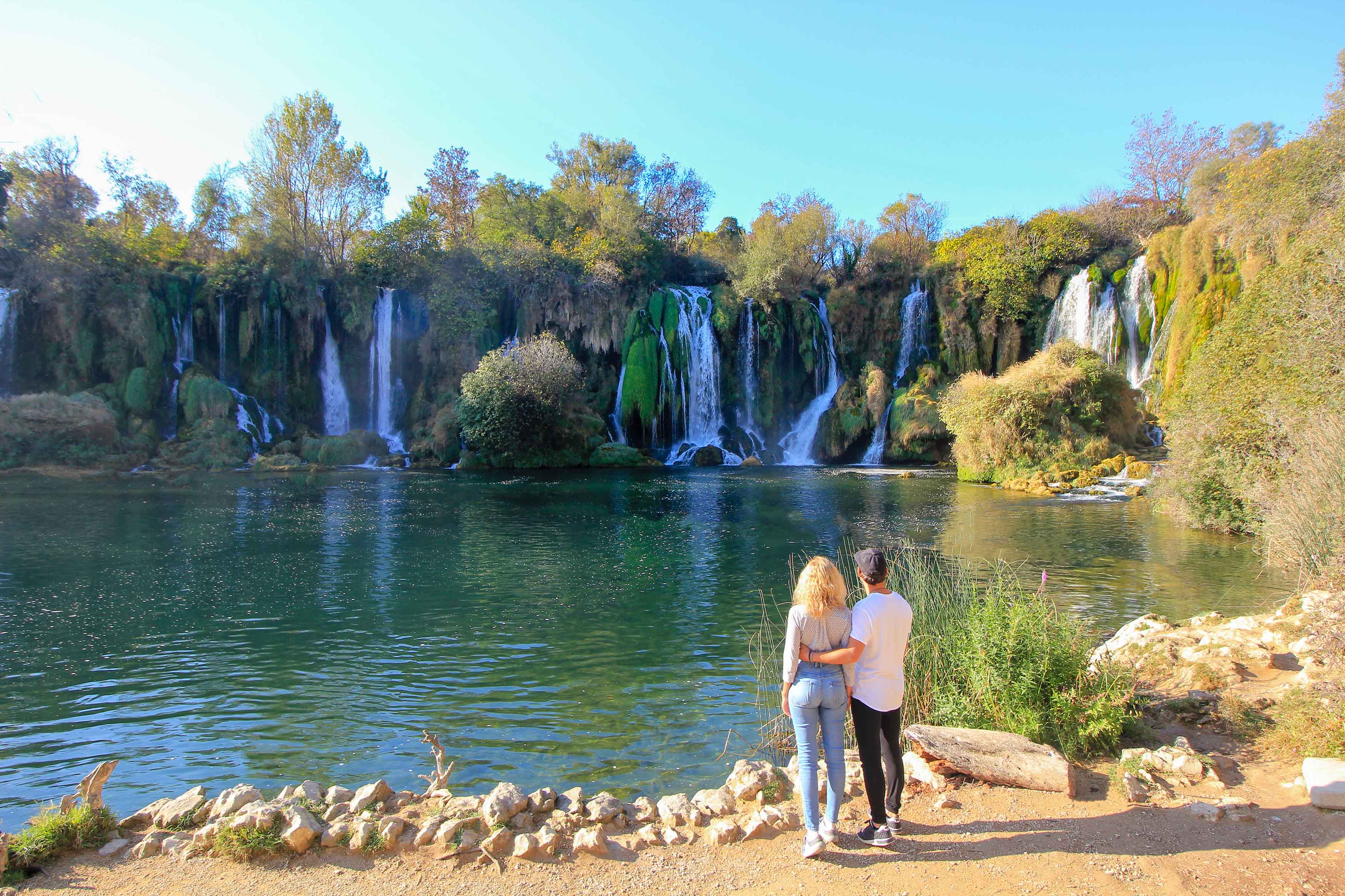 Die Kravica Wasserfälle liegen rund 40 Kilometer von Mostar entfernt und gehören zu den absoluten Naturhighlights in Bosnien. Eingebettet in eine wunderschöne Waldlandschaft, bestaunt man hier tosende Wasserfälle. Die Höhe der Kravica Wasserfälle variiert zwischen 26 und 28 Metern und sie fallen über einen rund 120 Meter breiten Hang herab. Als extra Highlight ist hier das Baden im Wasserfall erlaubt, und so kann man sich im heißen Sommer ganz wunderbar abkühlen.