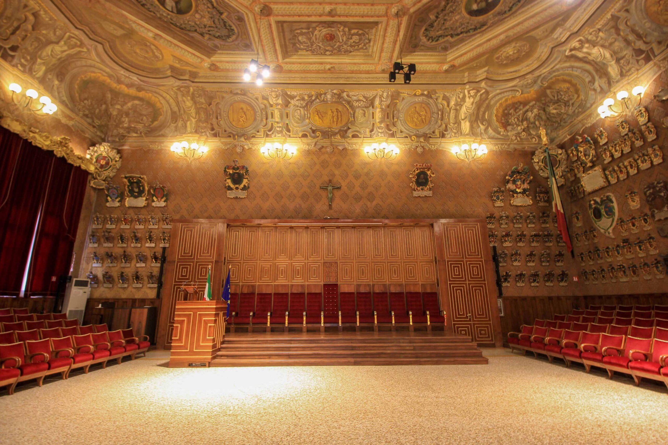 Der Palazzo del Bo mit dem weltberühmten Anatomischen Theater gehört mit Sicherheit zu den wichtigsten Sehenswürdigkeiten in Padua. Der Palast ist seit 1493 Sitz der Universität Padua, und in der Aula Magna hatte einst sogar Galileo Galilei gelehrt. Sehenswert sind der Innenhof „Cortile Anticos“ mit seinen vielen historischen Wappen, aber auch die Räumlichkeiten des Palazzo del Bo, die im Rahmen einer informativen Führung durch die Alte Universität besichtigt werden können. Ein wahres Juwel ist auf jeden Fall das älteste anatomische Theater der Welt. Es wurde bereits 1595 von Girolamo Fabrici nach einem Entwurf von Paolo Sarpi und Dario Varotari eingeweiht. Dieses Holztheater diente im 17. Jahrhundert den besten Universitäten Europas als Vorbild.