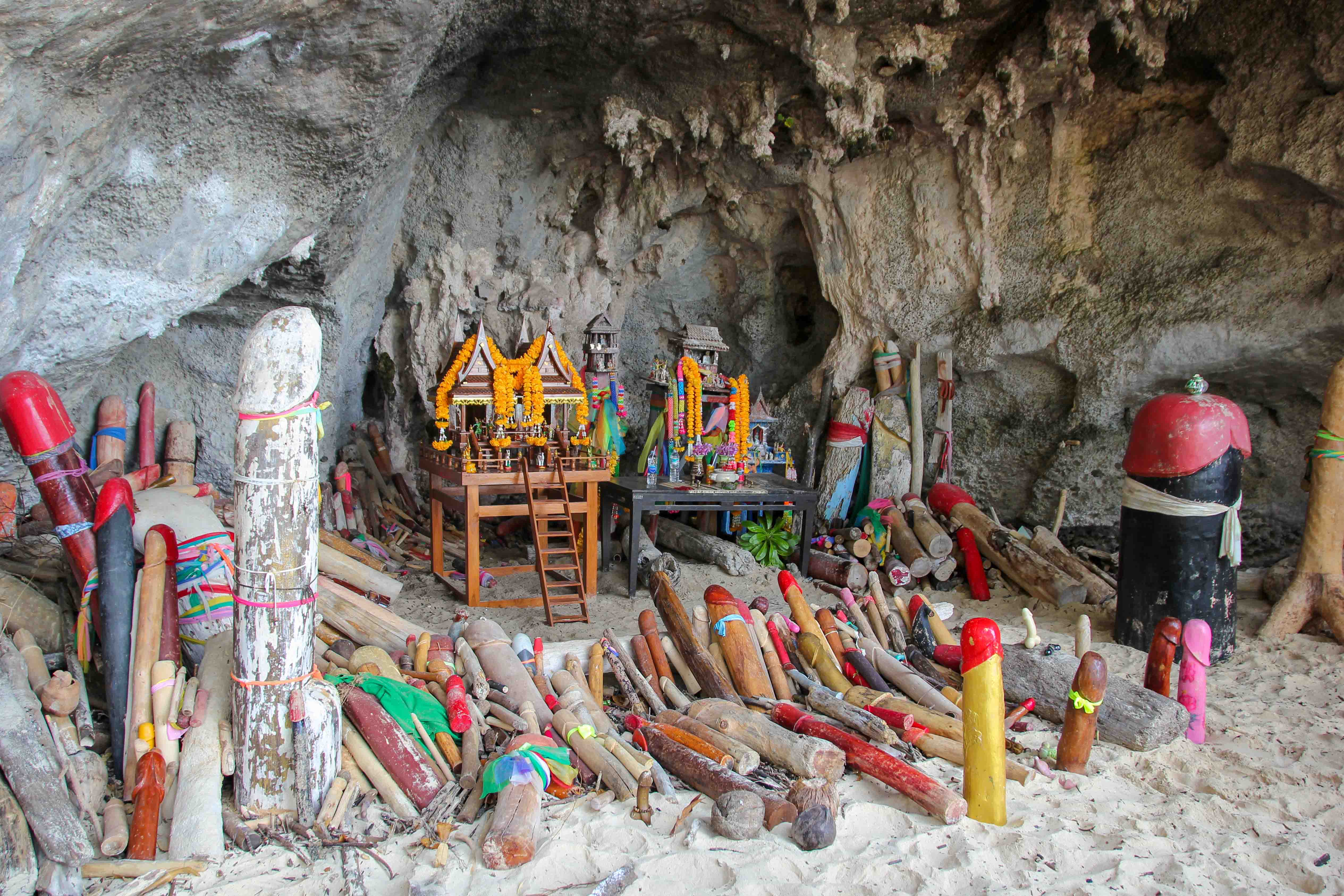 Die Phra Nang Cave, auch als Princess Cave bekannt, ist eine ganz außergewöhnliche Sehenswürdigkeit auf Railay. Sie liegt an der Spitze des Phra Nang Beaches und ist eine Felsenhöhle der besonderen Art. An diesem heiligen Ort, umgeben von mächtigen Kalksteinfelsgebilden, befindet sich ein Fruchtbarkeitsschrein. Damit hätten wir definitiv nicht gerechnet! Zahlreiche Penisse aus Holz und Stein befinden sich dort als Opfergaben, welche einen langersehnten Kinderwunsch und Fruchtbarkeit erfüllen sollen. Wirklich schön sind obendrein aber auch die imposanten Felswände über der Höhle, wo man auch Kletterer in schwindelerregenden Höhen beobachten kann.