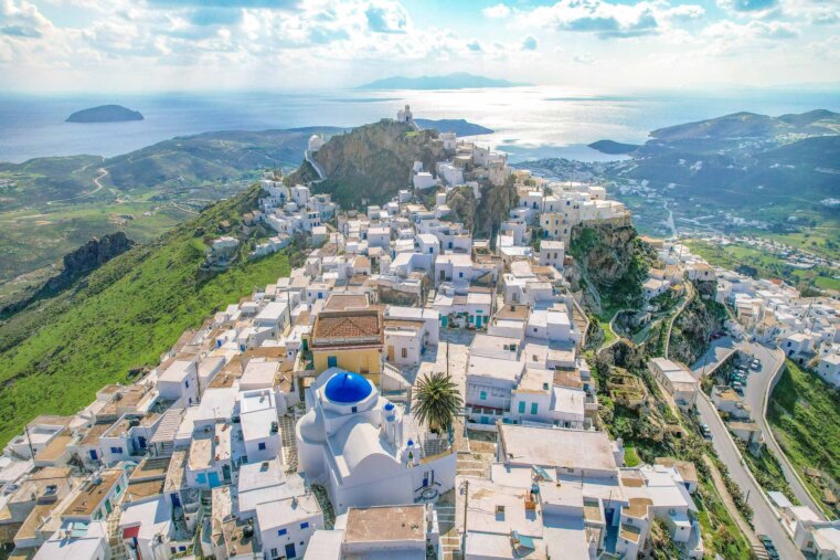 Der rund 500 Einwohner zählende Hafenort Livadi ist das touristische Zentrum von Serifos und gleichzeitig das Tor zur Insel. Übersetzt als „fruchtbare Wiesen“ legen dort die Fähren vom Festland sowie der umliegenden Inseln an, was diesen Ort auch zu einem beliebten Stopp beim Inselhopping macht. Viele Urlauber übernachten direkt hier, denn er ist auch ein toller Ausgangspunkt, um die Insel Serifos zu erkunden. In Livadi befindet sich außerdem der wunderschöne, rund 500 Meter lange Sandstrand namens Paralia Livadi Beach, der sich ideal für einen Urlaub eignet. Hier gibt es wirklich gute Unterkünfte, sowie einige charmante Tavernen, Cafés und kleine Geschäfte.