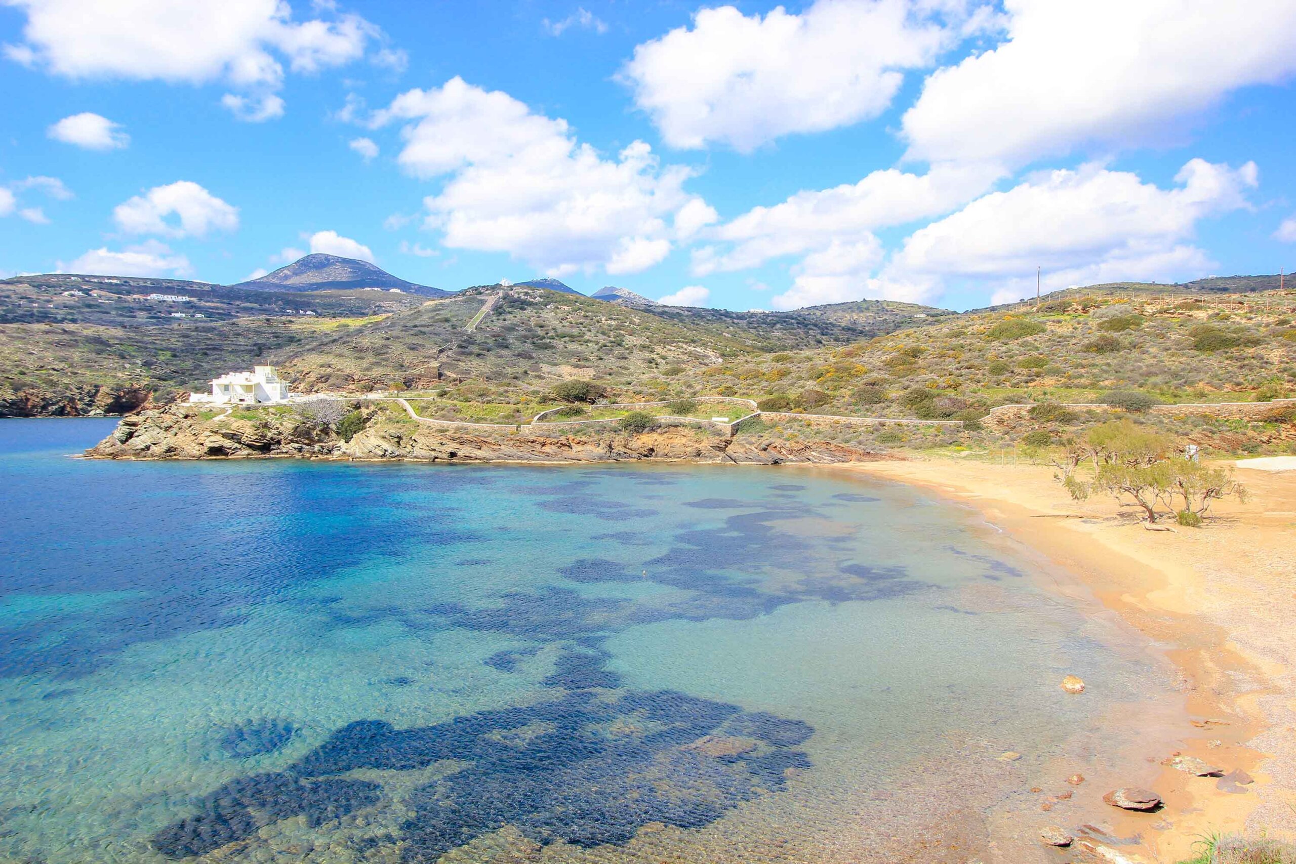 Der Strand Vathi ist für viele der schönste Strand auf Sifnos. Und tatsächlich, dieser lange Sandstrand ist definitiv einen Besuch wert. Er liegt sehr abgeschieden an der Westküste der Insel, und ist somit ein grandioses Ziel für entspannte Badetage. Eingebettet in einer malerischen Landschaft, mit türkisblauen Meeresfarben und mit den weiß-getünchten Häusern, genießt man einen Bilderbuchstrand vom Feinsten. Der Sandstrand fällt flach ins Meer ab und ist somit auch für Familien mit Kindern eine tolle Wahl. An einigen Abschnitten stehen Sonnenschirme und Sonnenliegen zum Verleih bereit, und auch mehrere Tavernen sorgen für die nötige Verpflegung. Besonders sehenswert ist der nördliche Strandabschnitt, wo sich die wunderhübsche kykladische Kirche Taxiárchēs befindet.