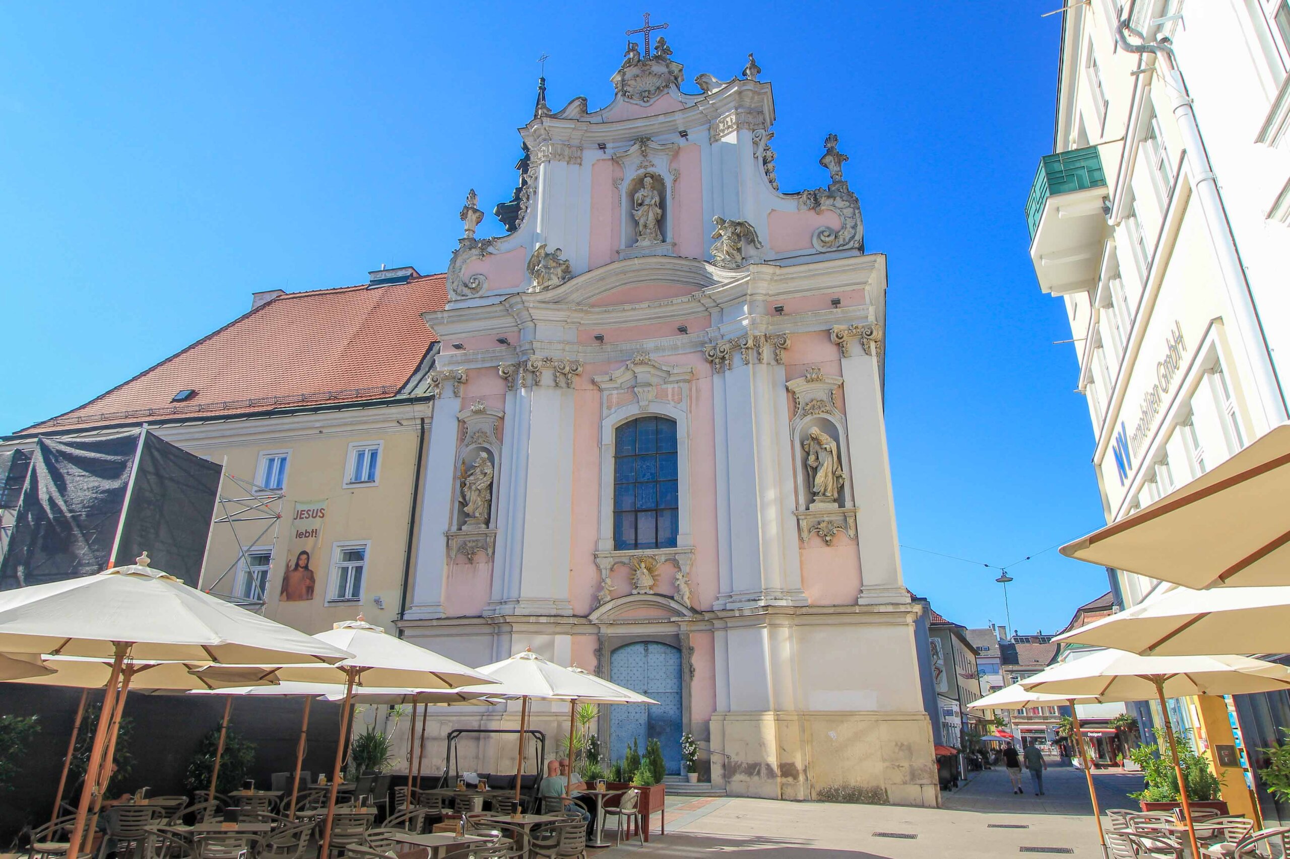 Die Franziskanerkirche, auch als Pfarrkirche Heilige Dreifaltigkeit bekannt, ist ein wunderschönes Gotteshaus direkt am Rathausplatz in St. Pölten. Ursprünglich zwischen 1757 und 1768 als Kirche eines Karmeliterklosters errichtet, wurde sie 1785 von den Franziskanern übernommen und zur Pfarrkirche erhoben. Die eindrucksvolle, rosa leuchtende Rokokofassade mit den kunstvollen Statuen prägt das Stadtbild und steht unter Denkmalschutz.