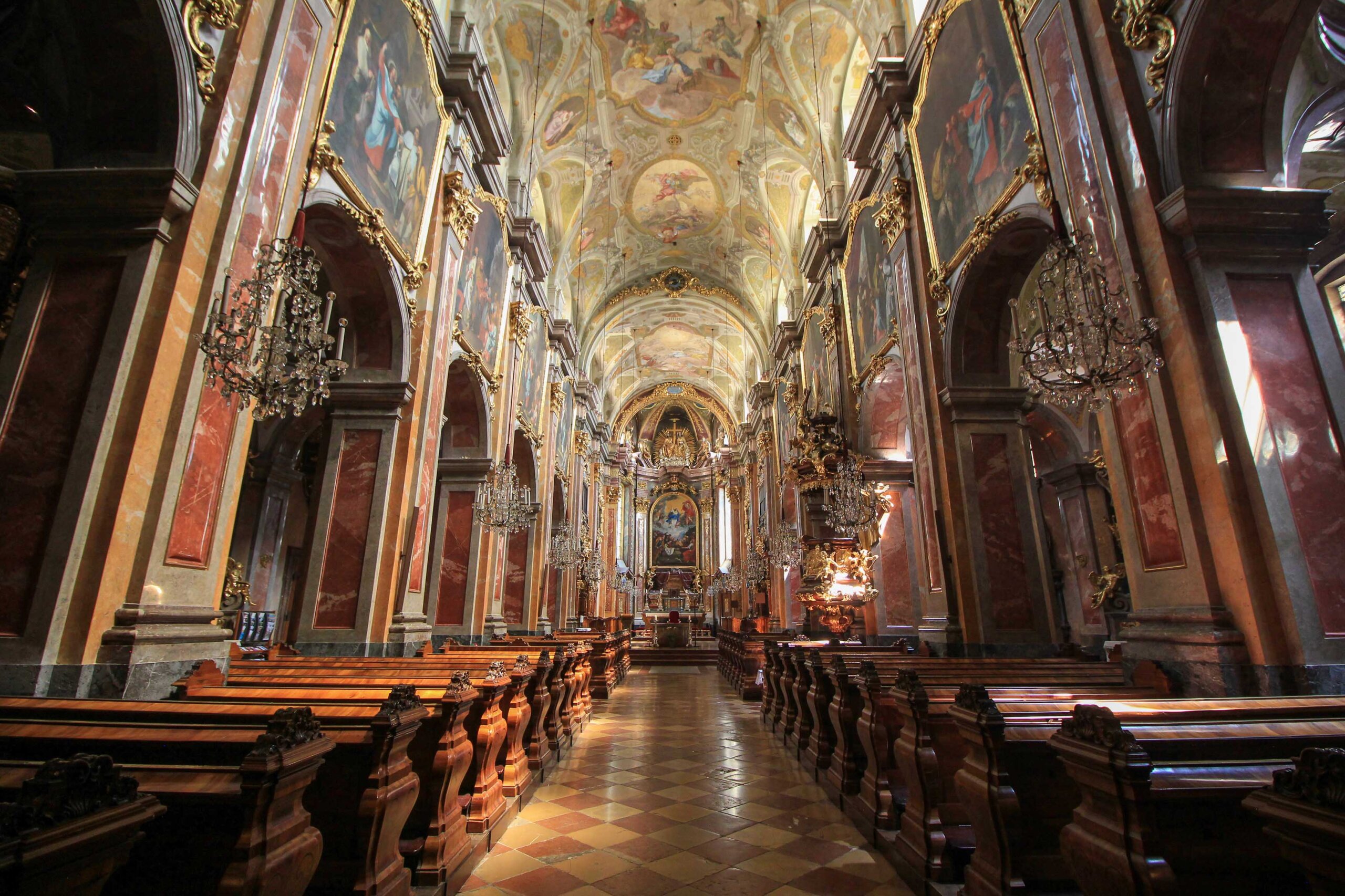 Auch das Innere ist sehenswert! Dort beeindruckt die Kirche durch ihre prachtvolle Ausstattung, die großteils aus dem 18. Jahrhundert stammt, darunter der prächtige Hochaltar und mehrere Seitenaltäre mit Altarbildern von Martin Johann Schmidt.