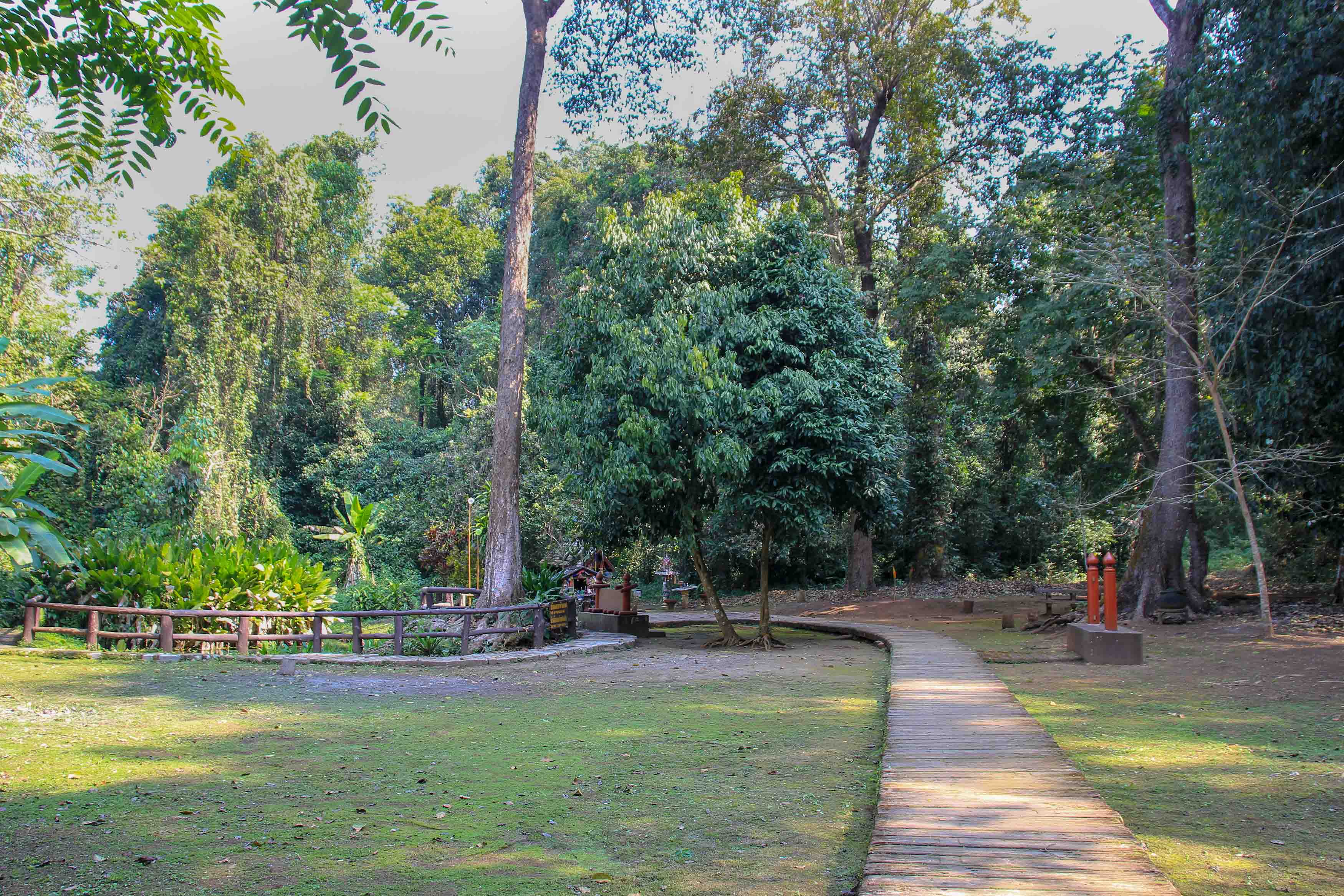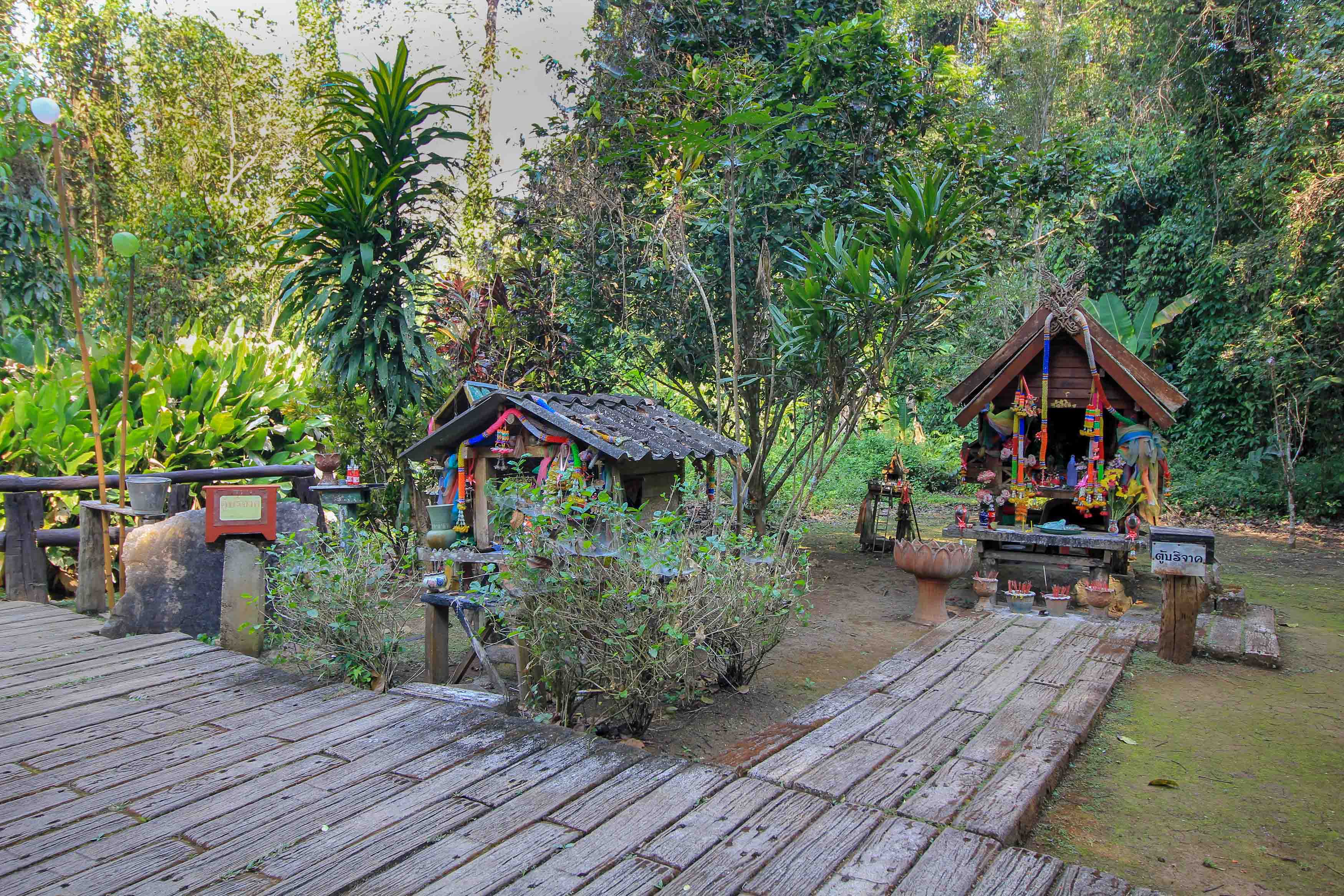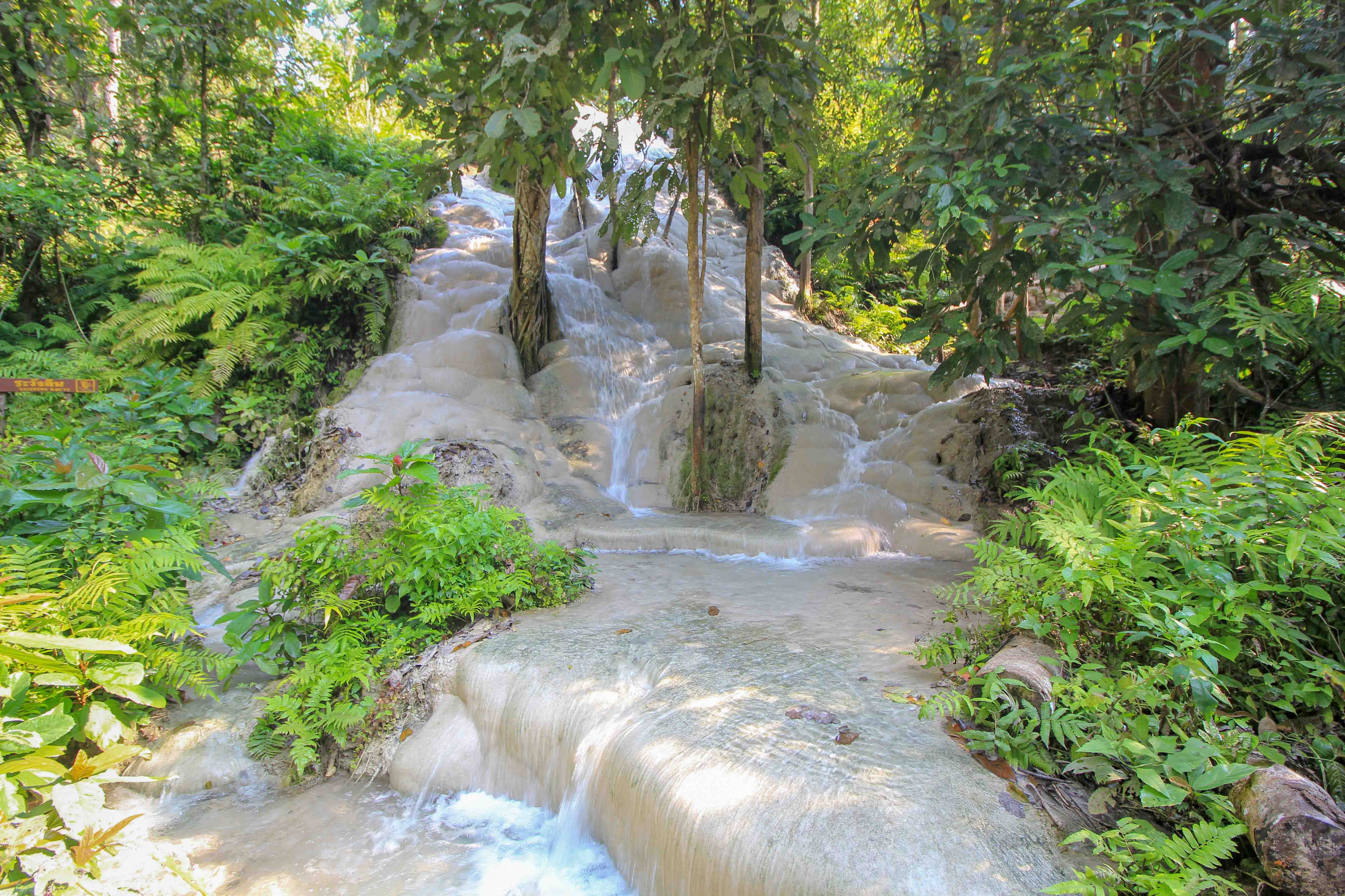 Nicht unweit vom Sticky Waterfall befindet sich die Nam Phu Chet Si Quelle ein weiteres schönes Naturschauspiel. Durch einen idyllischen Dschungelpfad spaziert man nur rund 10 Minuten zu den Quellen. Dort angekommen, bestaunt man einen Mineralgeysir, die Nam Phu Chet Si Quelle, welche in atemberaubenden Blautönen schimmert. Wenn man genau hinsieht, dann entdeckt man Bläschen, das Kalziumkarbonat, das aufsteigt. Sofort hat uns dieses Naturwunder an den Blue Pool des Emerald Pools in Krabi erinnert.