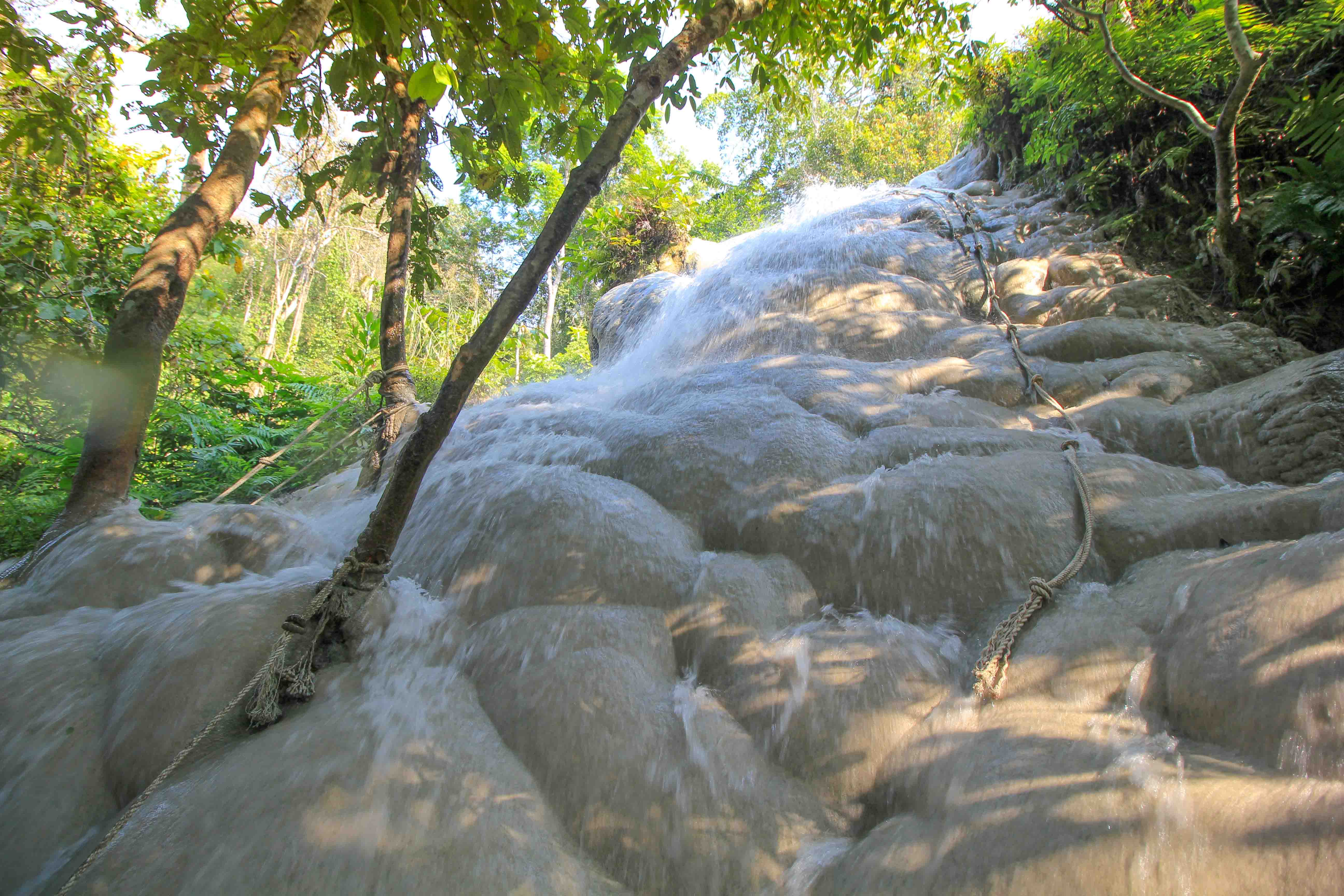 Das Highlight ist aber natürlich der Sticky Waterfall. Dieser Wasserfall ist in Thailand wirklich einzigartig und ein Geheimtipp für einen Ausflug ab Chiang Mai. Die Besonderheit liegt in seinem einzigartigen Aussehen. Über 3 Ebenen fällt dieser schneeweiße Wasserfall mit dem kalciumreichen Wasser den Hang hinab. Durch die Mineralien der Steine, genauer gesagt den Kalküberzug, bildet er eine fast rutschfeste Oberfläche und so kann man spielerisch den Sticky Waterfall auf und ab klettern. Seile bietet guten Halt, nur bei den verfärbten Stellen mit den Algen sollte man ein wenig aufpassen. Ein riesengroßer Spaß für Groß und Klein! Und wie man sieht, auch wir hatten unsere Freude beim Wasserfall-Klettern.