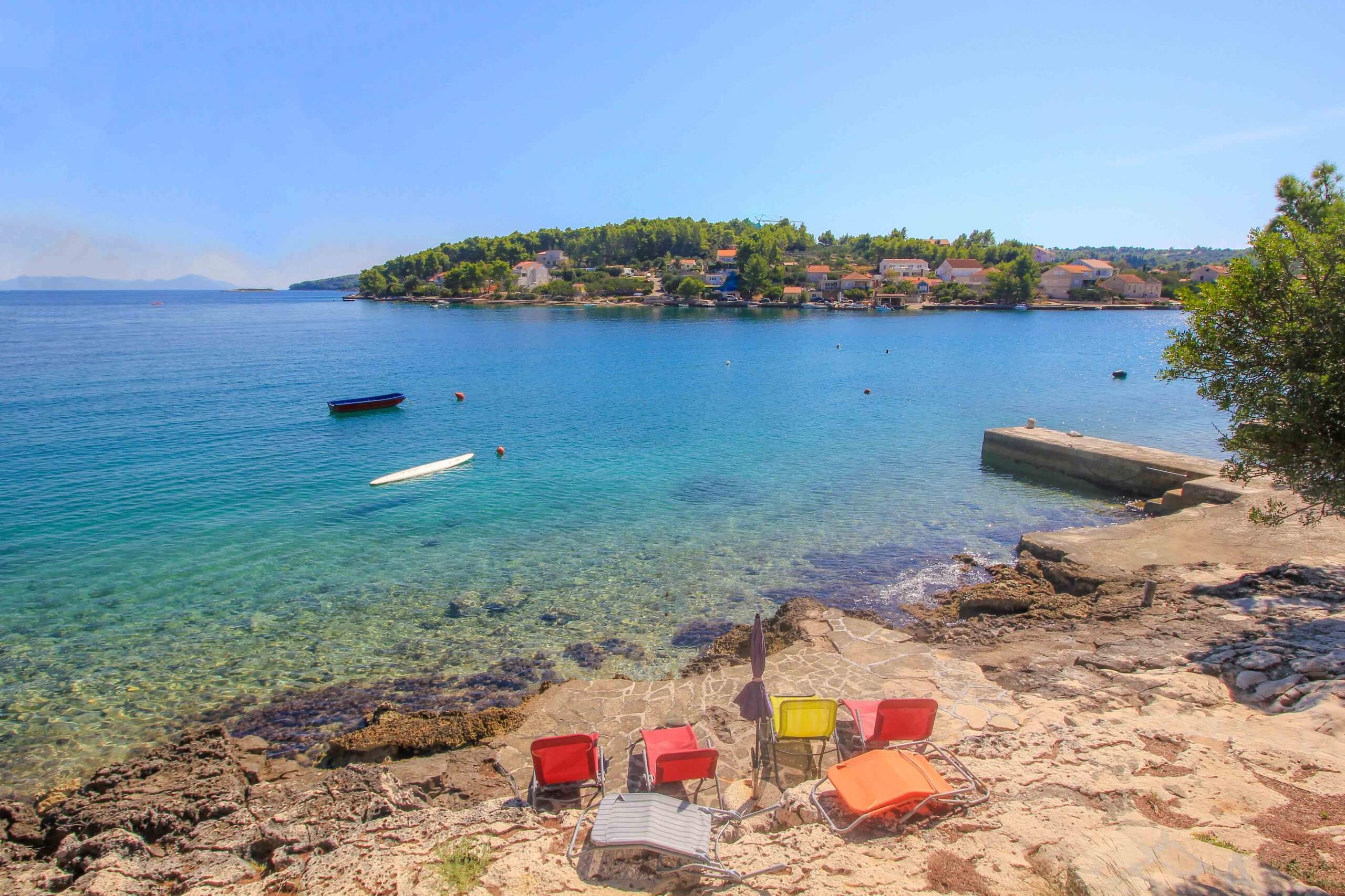 Absolut empfehlenswert und ein wunderschöner Ort für einen Urlaub in Lumbarda ist die malerische Bucht Racisce. Dieser Ort begeistert mit einer richtig ruhigen und entspannten Atmosphäre. Entlang der Küste befinden sich immer wieder kleine Badeplätze, die sich hervorragend zum Schwimmen und Sonnenbaden eignen. Duftende Pinienbäume sorgen hier für angenehmen mediterranen Duft und kühlen Schatten. Viele Apartments haben in der Uvala Racisce Bucht einen kleinen Steg für Hausgäste angelegt.