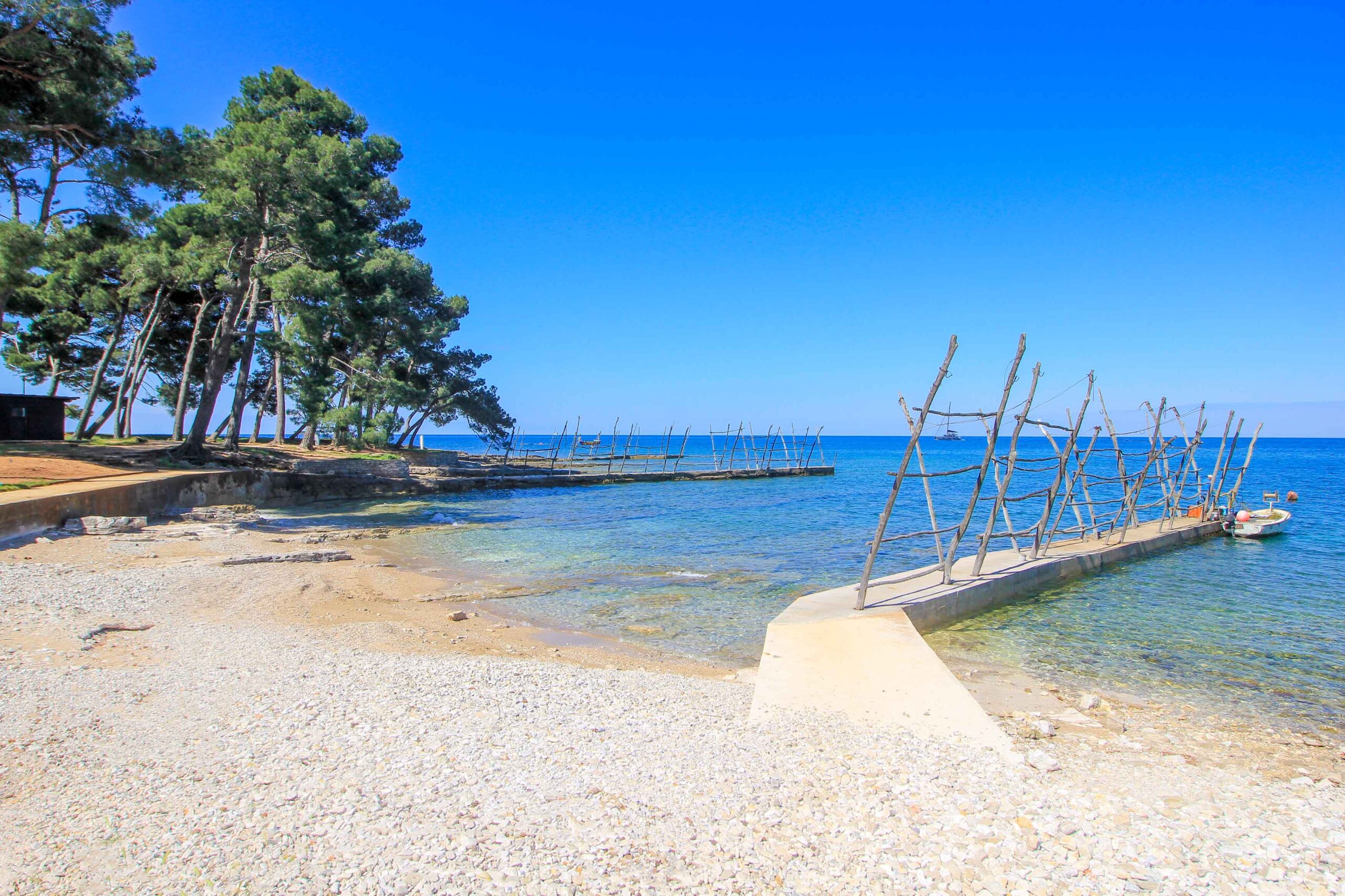 Ein richtig schöner Strand nahe bei Umag ist die bezaubernde Bucht der Villa Rosetta, einem empfehlenswerten Hotel im kleinen Urlaubsort Zambratija. Bei diesem Strand handelt es sich um einen Mix aus Fels- und Kieselstrand, der leichten Zugang zum kristallklaren Meer bietet. Vor allem Ruhesuchende und Pärchen schätzen diesen malerischen Strandabschnitt. Gleich dahinter dienen die wunderschönen, duftenden Pinien als natürlicher Schattenspender und verleihen der Badebucht einen äußerst idyllischen Charme. Es können aber auch gegen Gebühr, Liegen und Schirme gemietet werden. Ein wunderbarer Strand für ein paar erholsame Tage in Umag!