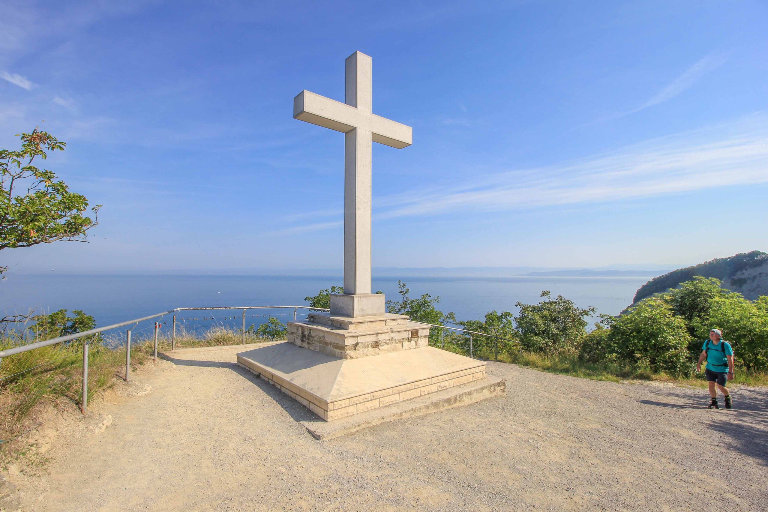 Einer der schönsten Aussichtspunkte der Region ist das Strunjan Kreuz. Es befindet sich im Landschaftspark Strunjan, dem sogenannten Parco naturale Strugano, und kann über eine kurze Wanderung vom Ortszentrum aus erreicht werden. Hoch über der sichelförmigen Mondbucht gelegen, genießt du hier das wohl spektakulärste Ambiente der Küste mit ihren charakteristischen Flyschklippen. Der Ort besitzt zudem eine besondere spirituelle Bedeutung, denn einer alten Legende zufolge soll hier die Jungfrau Maria während eines Sturms erschienen sein und das aufgewühlte Meer beruhigt haben, woraufhin das Kreuz als Schutzsymbol aufgestellt wurde.