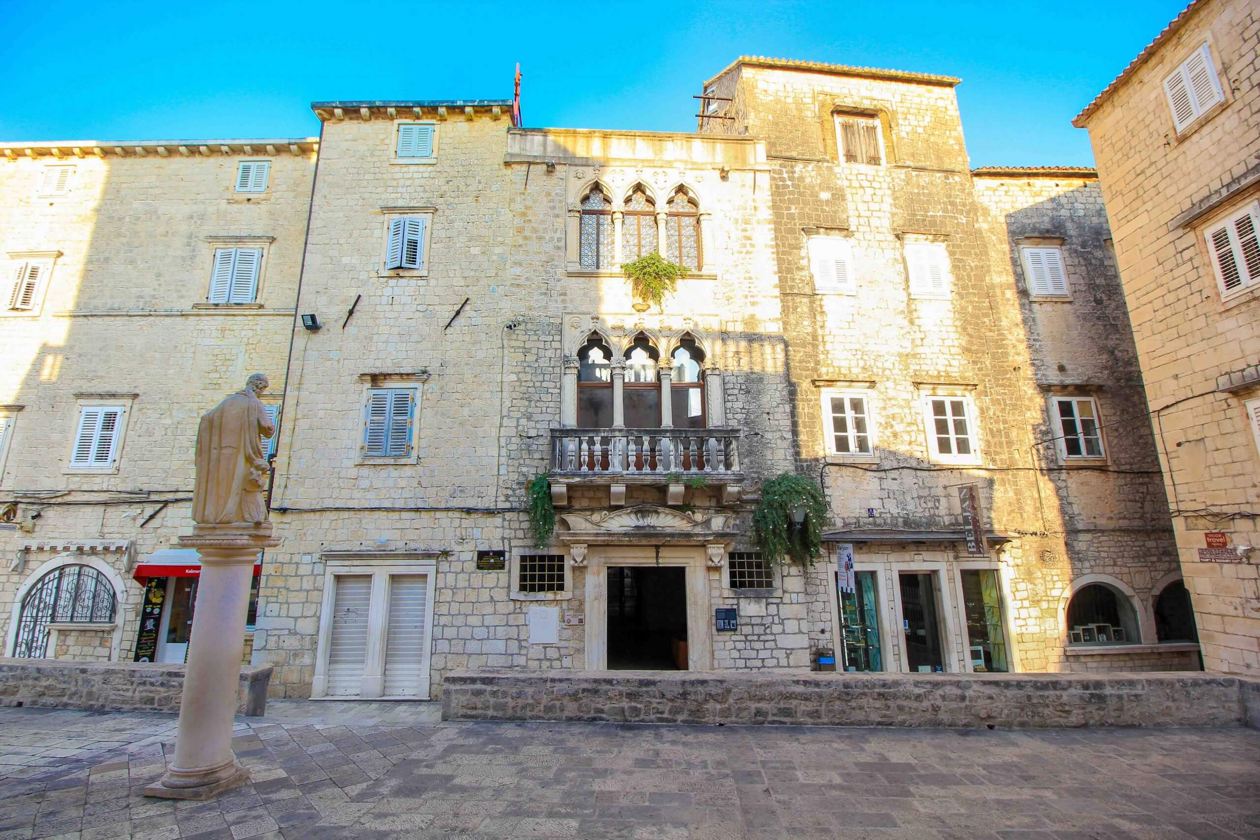 Wirklich schön und eine eher unbekannte Sehenswürdigkeit von Trogir ist der Cipiko Palast. Dieser historische Stadtpalast stammt bereits aus dem 13. Jahrhundert und wurde im venezianischen Baustil errichtet. Er befindet sich im Herzen der Altstadt von Trogir, direkt gegenüber der Basilika St. Martin oder St. Barbara. Zwar ist der Cipiko Palast von innen nicht für die Öffentlichkeit zugänglich, aber schon die Fassade mit den gotischen Drillingsfenstern ist ein faszinierendes Kunstwerk und ein beliebtes Fotomotiv in Trogir!