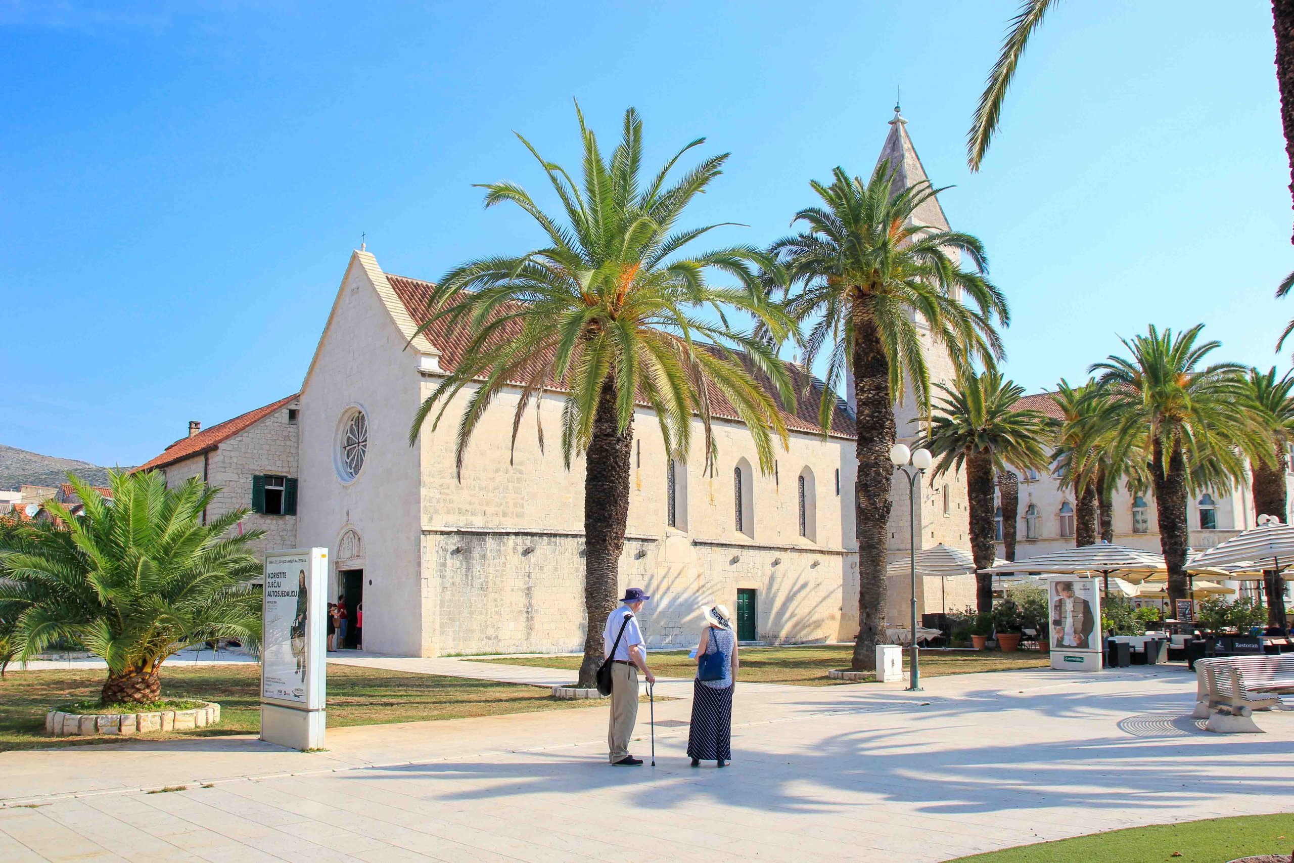 Trogir besitzt, wie viele Hafenstädte in Kroatien, eine wunderschöne Promenade. Sie zählt zu den schönsten Sehenswürdigkeiten im Zentrum und ist eines der Highlights der Küstenmetropole. Diese malerische Uferpromenade liegt direkt vor der Altstadt und kann bei einer Sightseeing-Tour kaum übersehen werden. Hier reihen sich Restaurants und gemütliche Cafés, in denen man bei einem kühlen Getränk die teils riesigen Jachten, die im Hafen liegen, bestaunt. Das Ambiente mit den dalmatinischen Steinhäusern, den hohen Palmen und dem Meer ist einfach umwerfend, und lädt zum gemütlichen Verweilen ein.