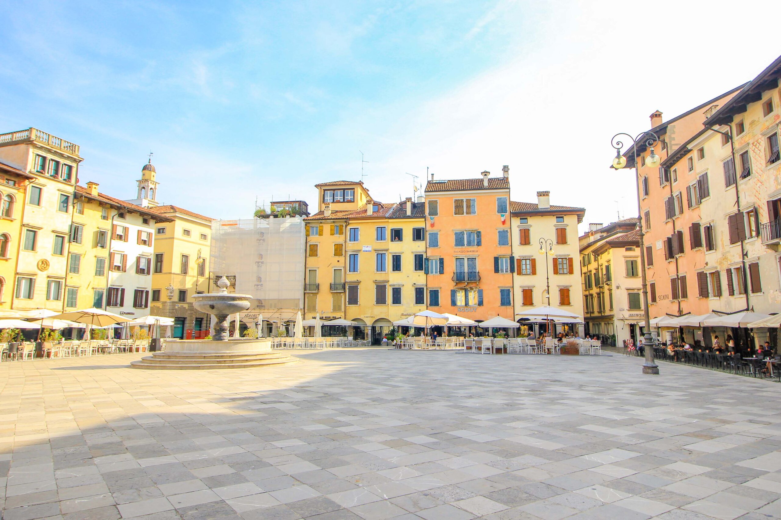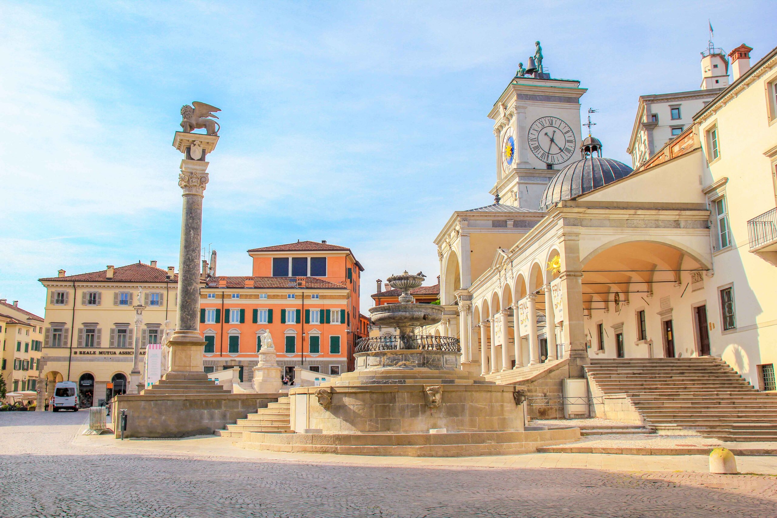 Die Piazza della Libertà ist mit Sicherheit eine absolut malerische Sehenswürdigkeit in Udine. Dieser außergewöhnliche Stadtplatz gilt unter Insidern als der schönste venezianische Platz außerhalb von Venedig. Und wirklich, hier bleibt keine Kamera still! Umgeben von zahlreichen Denkmälern und vielen historischen Attraktionen, erwartet dich dort eine Kulisse wie aus dem Märchenbuch. Absolut spektakulär sind dort der ikonische Uhrturm aus dem Jahr 1527, der Carrara-Brunnen aus der Renaissancezeit, die Säule mit dem Markuslöwen, der Gedenkbogen Arco Bollani, die rosafarbene Loggia del Lionello sowie die Loggia Tempietto di San Giovanni direkt gegenüber.