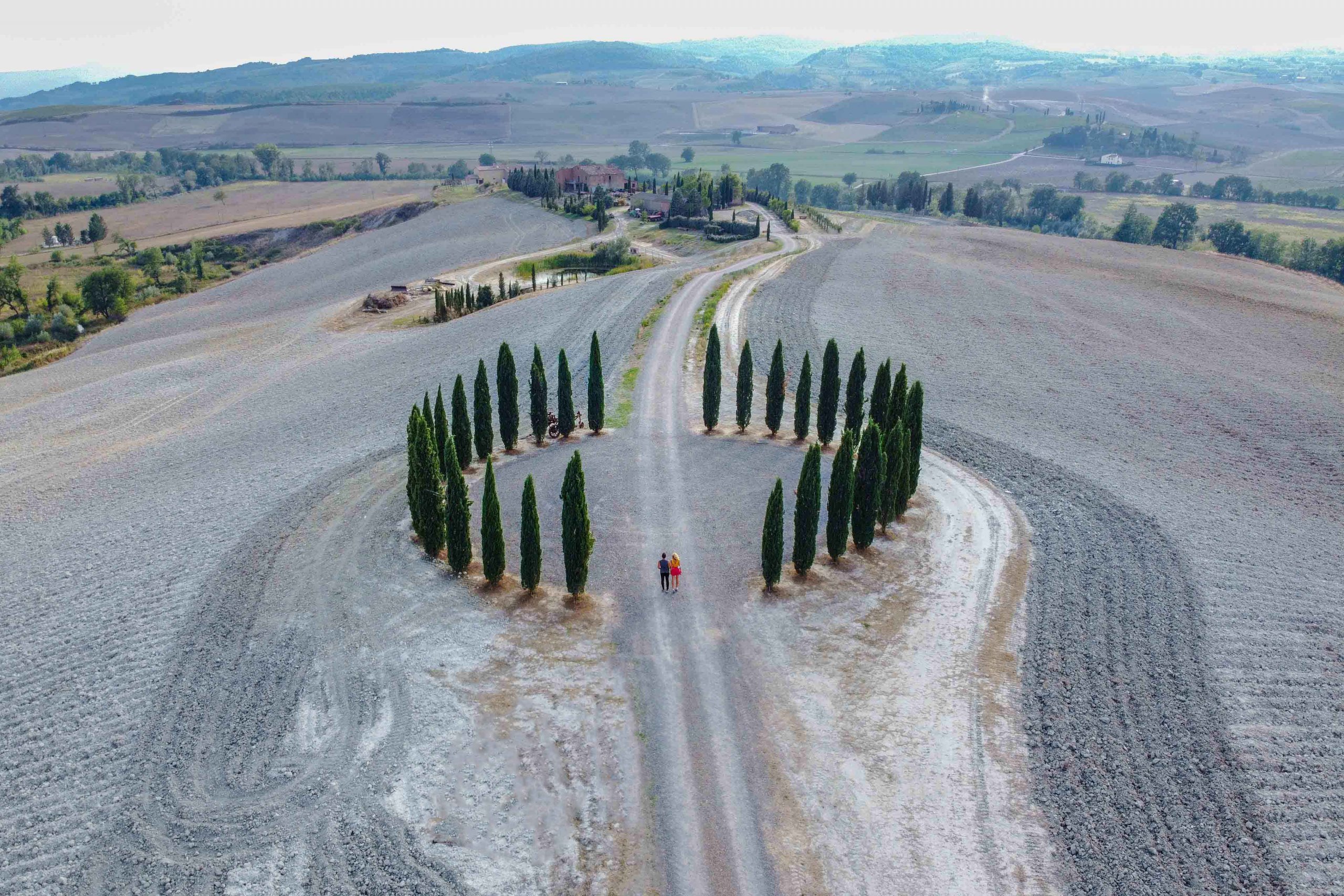 Charakteristisch für das Val d’Orcia sind zudem die unzähligen fotogenen Zypressenalleen, die zu den jeweiligen Bauernhöfen, Weingütern oder Anwesen führen. Einer der beliebtesten Fotospots im Orciatal ist die lange, malerische Allee vom Bauernhof Poggio Covili, die sich auf der Straße SR2 befindet. Hier werden einige der coolsten Instagram-Bilder der Toskana gemacht! Zwar darf die Allee nur von Gästen befahren werden, jedoch kann man schon direkt am Eingang tolle Bilder schießen. Diese Zypressenallee zählt zu den schönsten der Region und ist auf jeden Fall einen Stopp wert, wenn du das Val d’Orcia mit dem Auto oder Fahrrad erkundest!