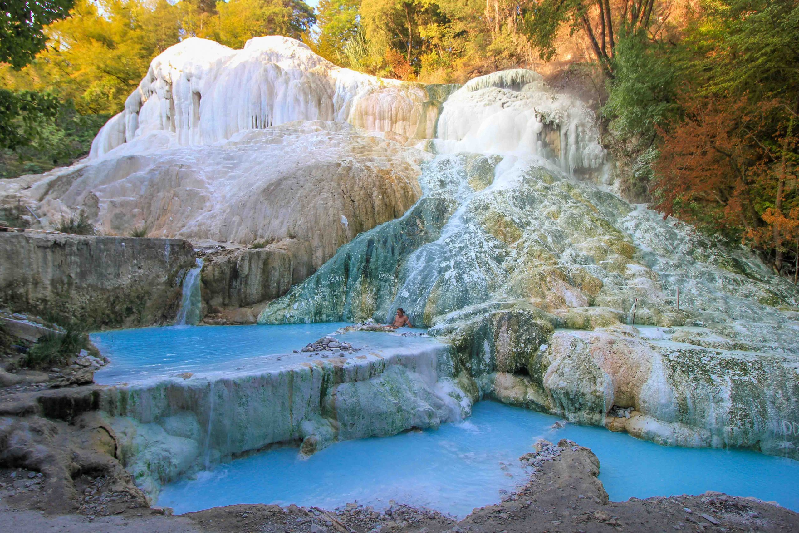 Die heiße Quelle bei Bagni San Filippo ist ein echter Geheimtipp für einen Urlaub im Val d’Orcia. Sie gilt als das älteste natürliche und zugleich von Menschen genutzte Heilbad der Welt, das direkt aus einer heißen Quelle gespeist wird. Man vermutet, dass in dieser Quelle bereits die Etrusker und die Römer gebadet haben. Wunderschön ist vor allem der Flusslauf mit den Naturbecken direkt im Wald, wo versinterte weiße Kaskaden für ein fabelhaftes Ambiente sorgen. Hier badet man direkt in einem heißen Fluss, im sogenannten Fosso Bianco und genießt dabei eine märchenhafte Ruhe! Wir waren mehrmals hier und fanden den Besuch am frühen Morgen am angenehmsten, bevor es voller wird.