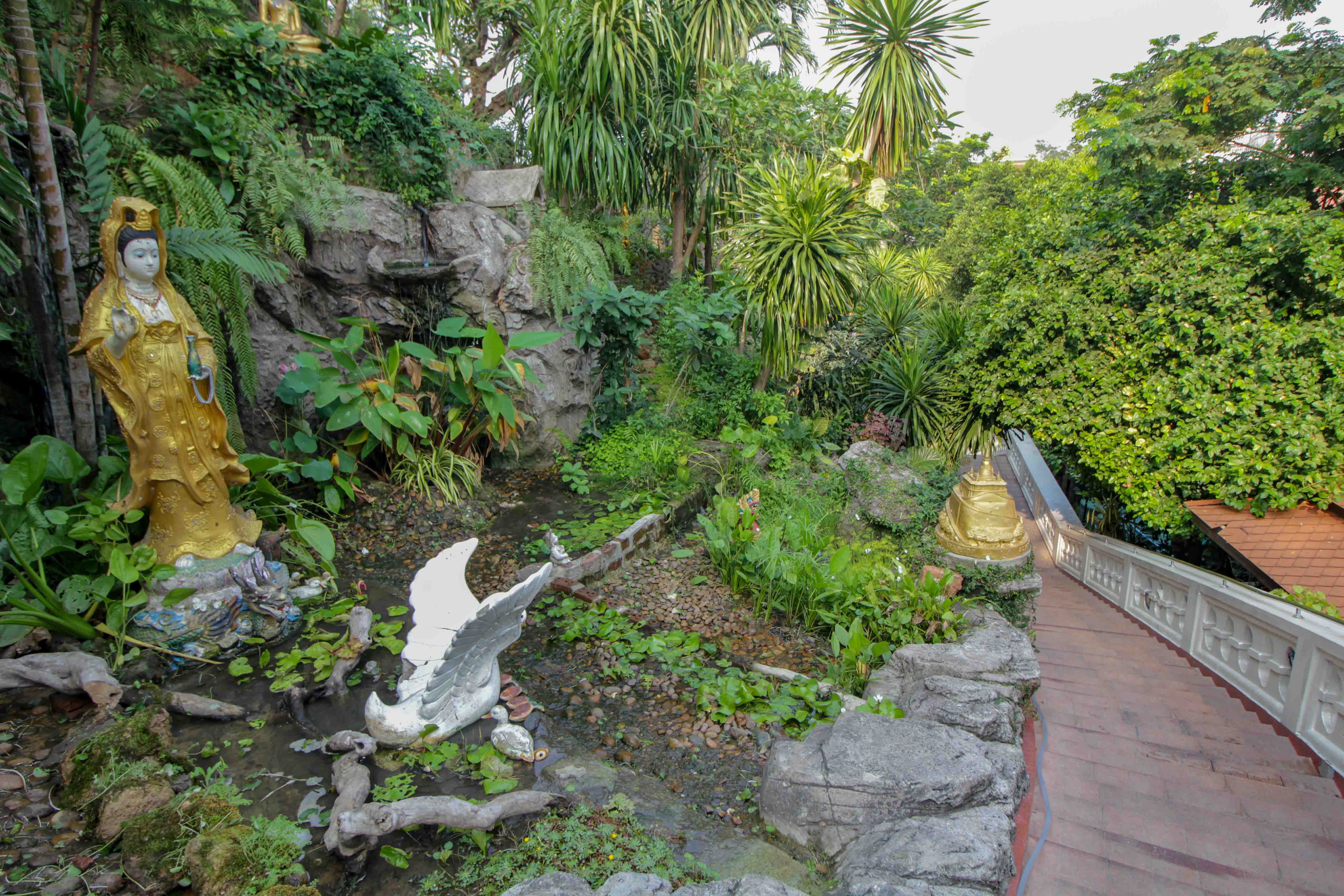 Der Wat Saket liegt auf 79 Metern Höhe und ist einer der berühmtesten Tempel in Bangkok. Für den Aufstieg müssen 318 Stufen, die sich spiralförmig empor schlängeln, erklommen werden. Dies ist zwar mit einer kleinen Anstrengung verbunden, trotzdem aber sind die meist niedrigen Stufen leicht zu schaffen. Der Weg nach oben ist richtig idyllisch und man kann sich für diesen Spaziergang schon etwas Zeit nehmen. So kommt ihr vorbei an exotischen Pflanzen, schönen Buddha-Statuen, kleinen Bächen und auch teils skurrilen Figuren. Besonders hübsch sind die Glocken des Wat Saket, deren Läuten einen Teil des Gebetsrituals darstellen.