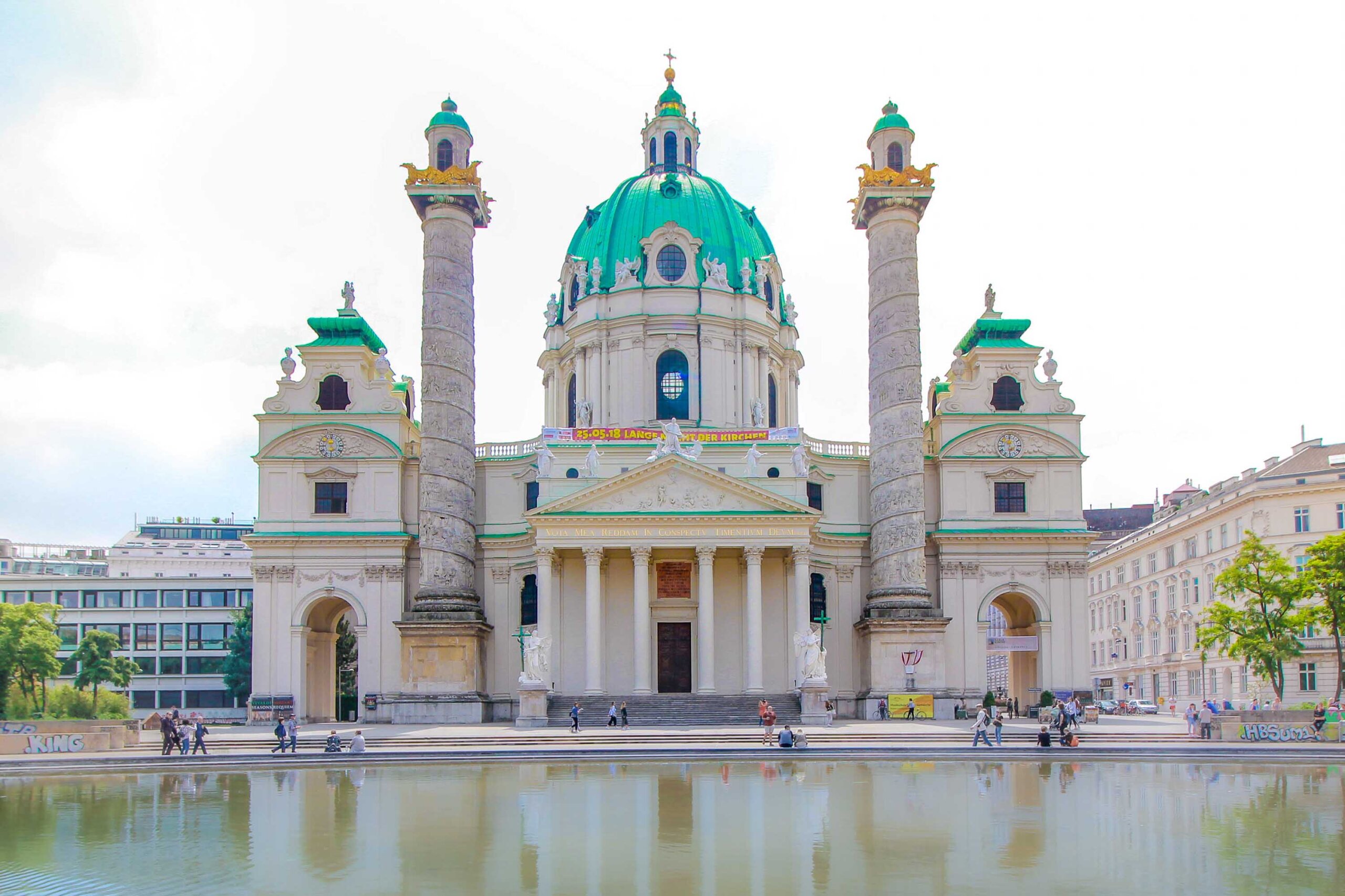 Die majestätische Karlskirche thront über dem Wiener Karlsplatz und gilt als eine der schönsten Kirchen der Stadt. Sie wurde von Johann Bernhard Fischer von Erlach, einem bedeutenden Barockarchitekten, entworfen und im Jahr 1739 fertiggestellt. Kaiser Karl VI. ließ sie als Gelübde während einer Pestepidemie errichten. Wirklich eindrucksvoll sind die monumentalen 47 Meter hohen Säulen neben dem Eingangsportal und die prächtige türkisblaue Kuppel mit den Fresken von Johannes Michael Rottmayr. Unbedingt sehen sollte man auch das Innere, wo ein reich-verzierter Hochaltar und eine wunderschöne Marmoroptik begeistern. Zudem kann man gegen Gebühr die Aussichtsterrasse besuchen, von der man einen tollen Blick auf den Karlsplatz genießt.