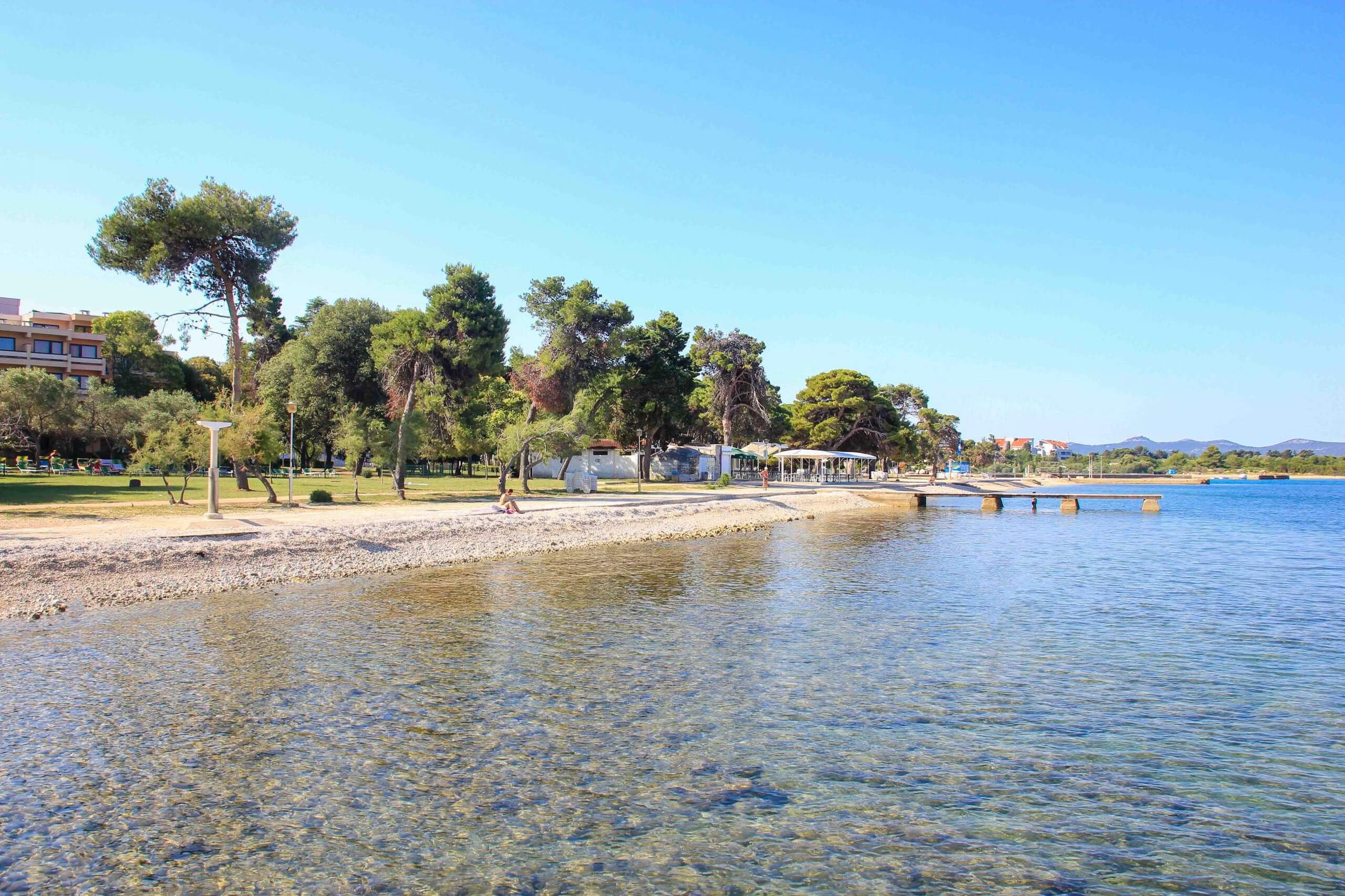 Etwas südlich der Altstadt liegt der Strand Kolovare, eine der wohl schönsten Buchten in Zadar. Hierher kommen Urlauber und auch Einheimische gerne zum Baden. Bei einem Besuch erwartet dich ein Mix aus sehr feinem, fast schon sandigem Kieselstrand und gepflegten betonierten Badeplätzen. Kühlen Schatten findet man unter den Pinien am nördlichen Strandabschnitt oder unter den zu mietenden Sonnenschirmen. Toll ist hier auch das touristische Angebot, denn in der Nähe vom Strand Kolovare gibt es günstige Restaurants und Café-Bars, aber auch kleine Kioske und Eisdielen.