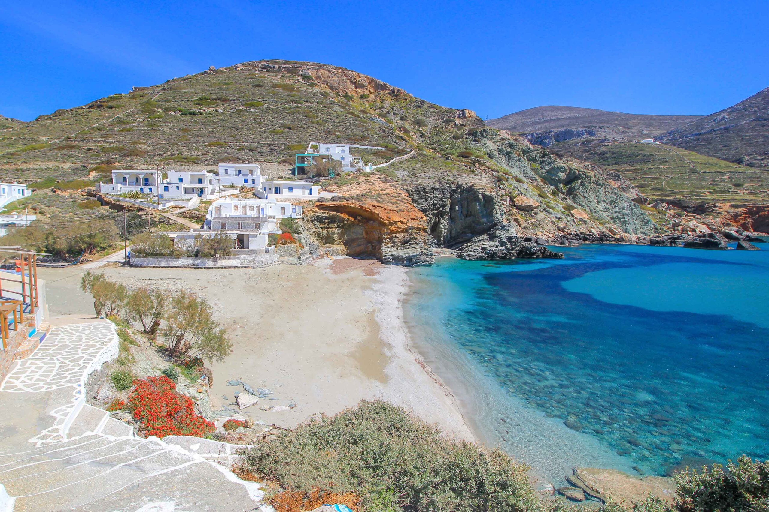 Agali is a tiny, beautiful village on the west coast of Folegandros. It is located in a gorgeous rocky bay, about 4 kilometers from the main town of Chora, and is a fabulous choice for a beach vacation on the island. In fact, in Agali and nearby are some of the most beautiful bays. The most spectacular is the eponymous Paralia Agali, with its magnificent white sandy beach and turquoise sea colors. The bay is sheltered from the wind and waves, which is also appreciated by families with children. In the village there are also a few good accommodations, and traditional taverns and cozy cafés provide local dishes and drinks.