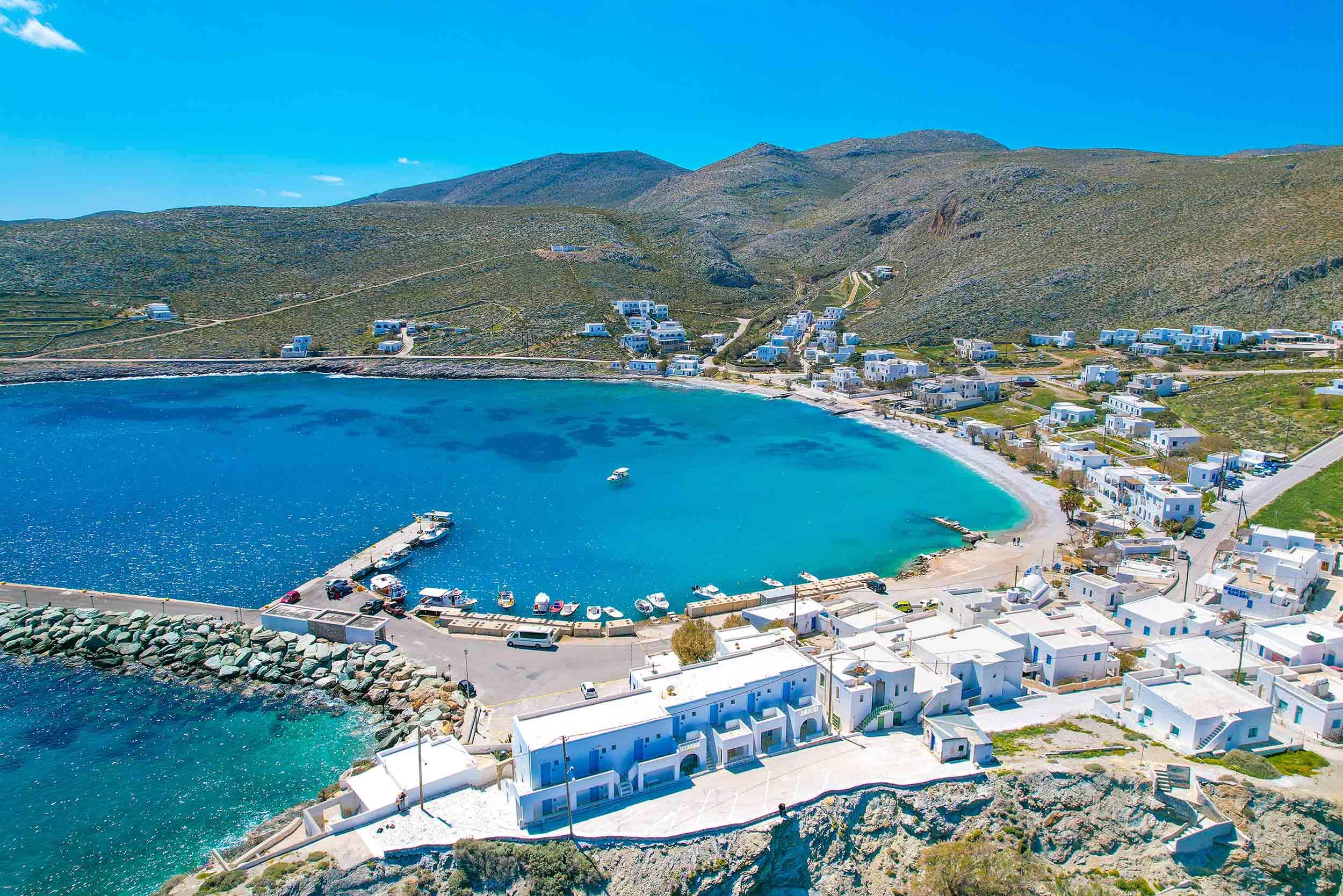 Karavostasis is the lovely little harbor village in the southeast of Folegandros and, by the way, a fabulous choice for a perfect stay on the vacation island. The village is nestled in beautiful landscape, and the white houses together with the turquoise sea and the two picturesque beaches form a backdrop like on a postcard. The place is absolutely romantic, and the atmosphere is hushed and relaxed to boot. Nevertheless, you will find here a few taverns, beach bars, nice accommodations, a travel agency and also two small supermarkets. In the summer months, excursion boats take you to other beaches on the islands and a public bus connects the harbor town with the Chora.