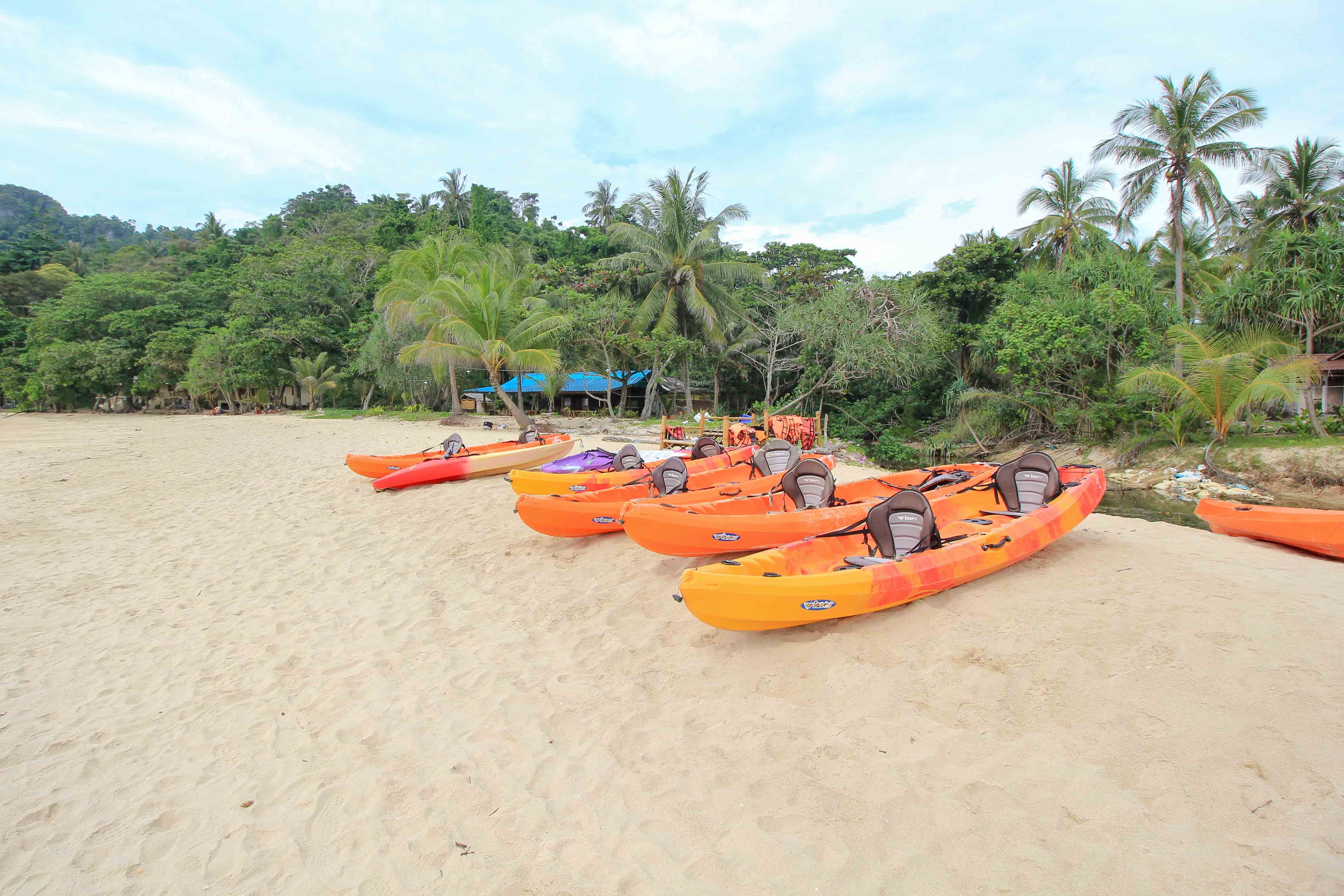 Autour de l’île de Koh Mook, on trouve de nombreux récifs coralliens et de bonnes zones pour la plongée avec tuba, que l’on peut atteindre par une excursion en bateau à longue queue ! À certains endroits, tu peux découvrir de très beaux poissons multicolores, comme des poissons-clowns et des étoiles de mer géantes. Les visites peuvent être réservées sur place et combinées avec l’excursion à Emerald Cave. Une excursion en kayak est une bonne manière de parcourir la côte de Koh Mook. Tu peux louer des kayaks à bas prix directement à Charlie Beach. De là, il est également possible de se rendre à la grotte Emerald Cave.