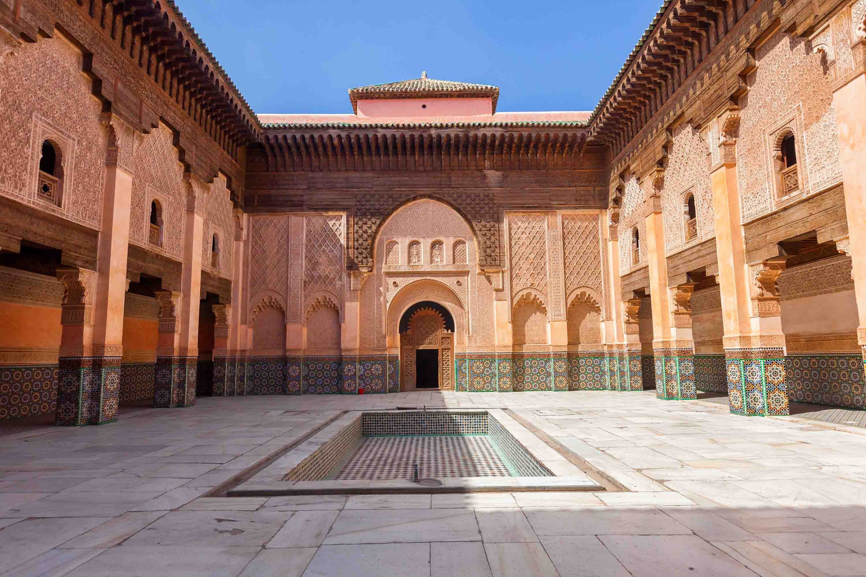 La Medersa Ben Youssef est une ancienne école coranique située directement dans la médina de Marrakech. Elle a été fondée en 1340, mais une grande partie de l’intérieur date de 1570, lorsque le sultan saadien Abdallah al-Ghalib régnait. Pendant plusieurs siècles, jusqu’en 1960, le bâtiment a servi d’établissement d’enseignement. Dans la magnifique cour intérieure se trouve un grand bassin de fontaine et les murs sont magnifiquement décorés de mosaïques colorées. L’ensemble de l’architecture de l’école coranique est unique, notamment les piliers en bois de cèdre sculpté et les ornements en faïence qui émerveillent les visiteurs. L’ambiance générale de cette école est unique, elle vaut tout simplement la peine d’être vue et fait donc partie des meilleures attractions touristiques de Marrakech.