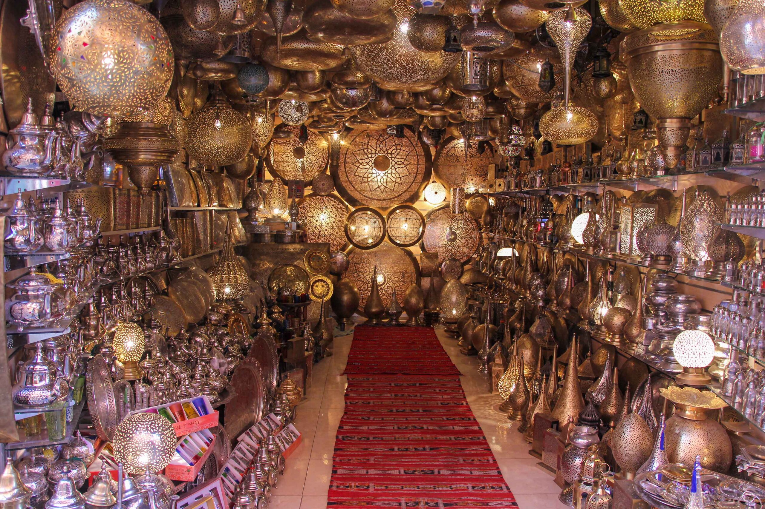 La place des Ferblantiers est l’une des meilleures attractions touristiques de Marrakech. Elle se trouve dans le sud de la médina et est facilement accessible lors d’un tour de ville. Il y règne une atmosphère merveilleuse et de nombreuses boutiques, dont beaucoup proposent des lampes marocaines traditionnelles, invitent au shopping. Cette jolie place bordée de palmiers est entourée de petits ateliers où sont fabriquées les lampes marocaines typiques. Mais quelques marchands d’épices se sont également installés ici, et d’agréables cafés, comme le charmant Mazel Cafe, invitent à savourer et à s’attarder.